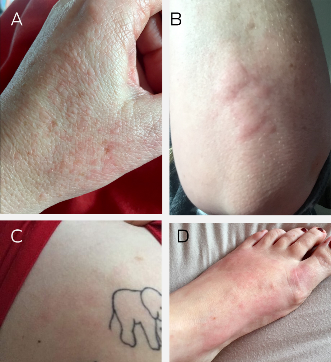 A: Maculopapular erythematous eruptions on the patient’s hand. B: Wheal and flare pattern of urticaria on her elbow. C: Macular erythema and urticarial eruption on her chest. D: Macular coalescing erythema on dorsum of her foot with perniosis involvement of toes in areas.