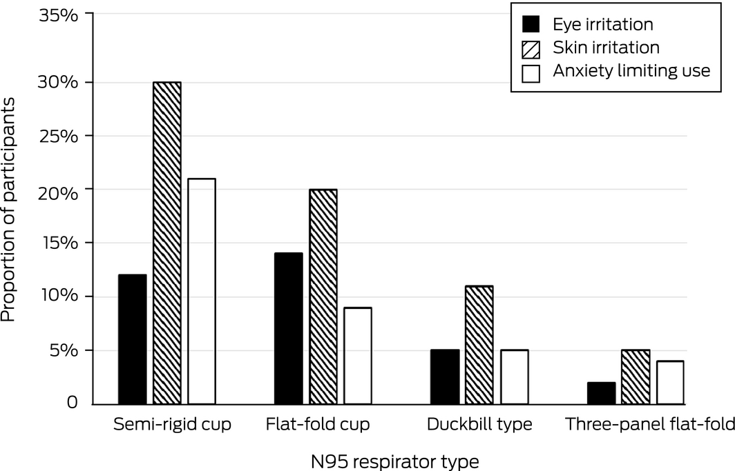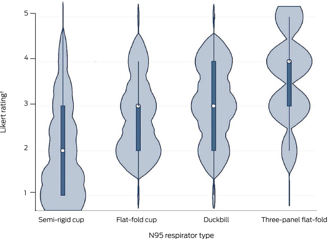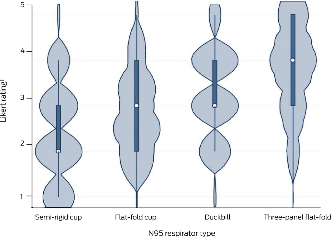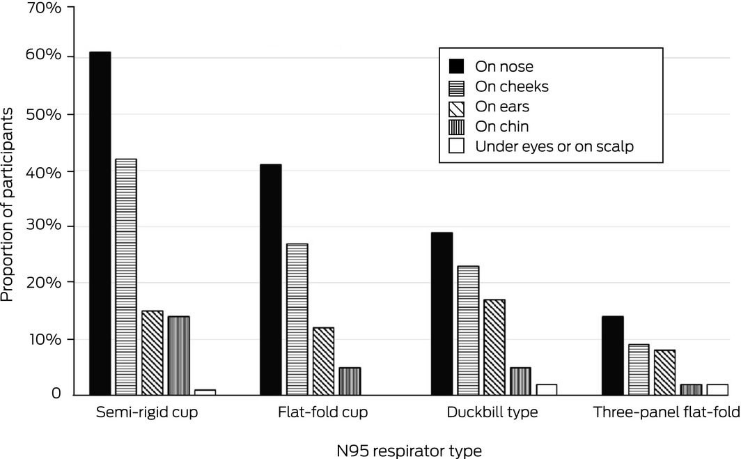 Respirators used in health care settings, as medical devices under the Commonwealth Therapeutic Goods Act 1989, must be included in the Australian Register of Therapeutic Goods.11 Several types of N95 respirator have been registered, but assessing fit test pass rates, usability, and comfort is not required by the certification process.8,12,13 A 2015 review of respirator literature14 found only limited information on these characteristics, and only a few small studies have assessed comfort and usability.10,15,16,17,18 Most found no significant differences in outcomes; in one study (27 volunteer participants), the duckbill type and respirators with exhalation valves were better tolerated than cup style respirators or respirators without exhalation valves.18