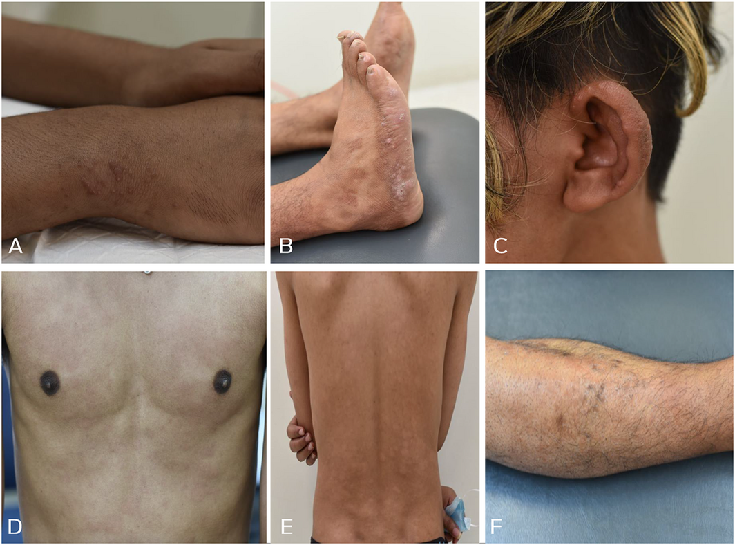 A: Multiple papules located on the patient’s wrists. B: Papules and nodules located on the lateral aspects of his feet. C: Nodules and skin thickening on his ears bilaterally. D: Multiple erythematous plaques on his torso symmetrically. E: Multiple hypopigmented macules on his back symmetrically. F: Patch of ichthyosis with hypopigmentation, erythema and hypotrichosis overlying his lower leg.