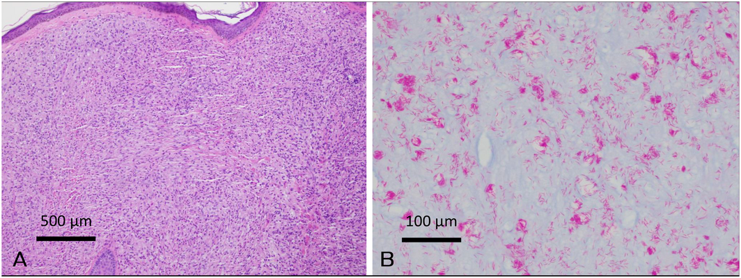 Given the polymorphic rash, multiple biopsies at the edge of lesions were done to accurately establish the diagnosis. Biopsy samples from his ear, back and foot showed foamy histiocytes throughout the dermis with intracytoplasmic vacuoles, consistent with multibacillary leprosy (Box 2, A). A left wrist biopsy showed a granulomatous response with perineural histiocytic infiltrates, consistent with paucibacillary leprosy. Wade–Fite staining confirmed the presence of acid‐fast bacilli in the cytoplasm of histiocytes (Box 2, B), with polymerase chain reaction testing confirming presence of Mycobacterium leprae. Serological investigations and chest x‐ray for comorbid conditions and clinical mimics that can present with a polymorphic rash were negative for syphilis, human immunodeficiency virus, strongyloidiasis, tuberculosis, and sarcoidosis.