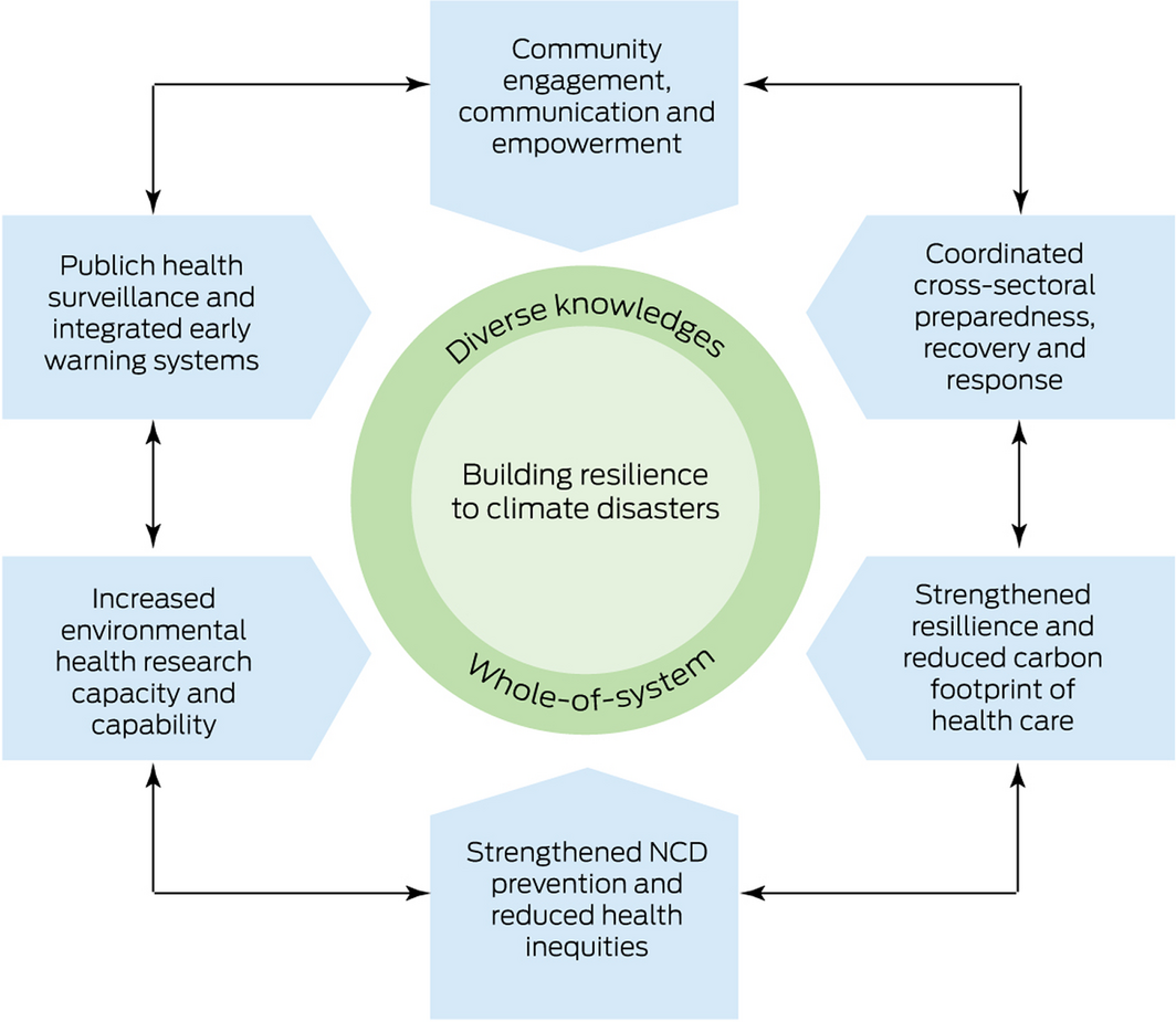 The converging impacts of climate change, extreme events, COVID‐19, NCDs, socio‐economic inequities, population ageing and urban growth require an integrated whole‐of‐system response. This should focus on flood‐ and fire‐resilient land‐use planning that will reduce community exposure to climate‐related risks and systemic vulnerability in the long term,17 improved housing conditions for low socio‐economic households, agile and high value health care, strengthened public health surveillance and emergency warning systems, and a net‐zero carbon economy.
