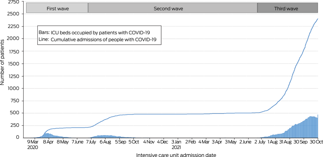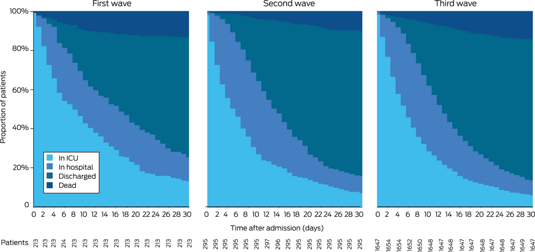 Design, setting, and participants: People aged 16 years or more admitted with polymerase chain reaction‐confirmed COVID‐19 to the 78 Australian ICUs participating in the Short Period Incidence Study of Severe Acute Respiratory Infection (SPRINT‐SARI) Australia project during the first (27 February – 30 June 2020), second (1 July 2020 – 25 June 2021), and third COVID‐19 waves (26 June – 1 November 2021).