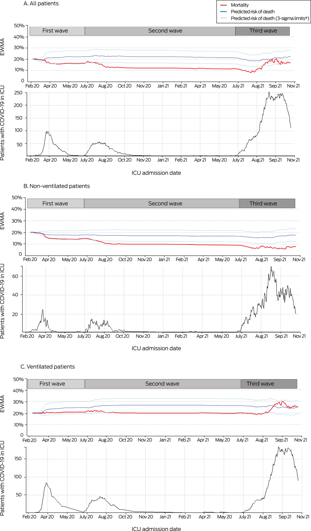 The proportion of ICU beds occupied by people with COVID‐19 was larger during the third wave (19.1%) than during the second (4.6%) or first waves (2.8%). The greater number of patients, together with unmeasured factors (eg, re‐deployment of non‐ICU staff, ICU staff fatigue, limited ICU resources), may have reduced the capacity to provide usual health care.26 Importantly, we found that differences in mortality between waves were different for ventilated and non‐ventilated patients. The EWMA chart indicated that higher mortality during the third wave was chiefly among patients receiving mechanical ventilation, and was correlated with peak admission numbers. Health care systems overwhelmed by the number of people with COVID‐19, as in Italy and New York during the early phase of the pandemic, experienced inadequate resourcing and delays in admission to intensive care that were associated with higher mortality rates.27,28