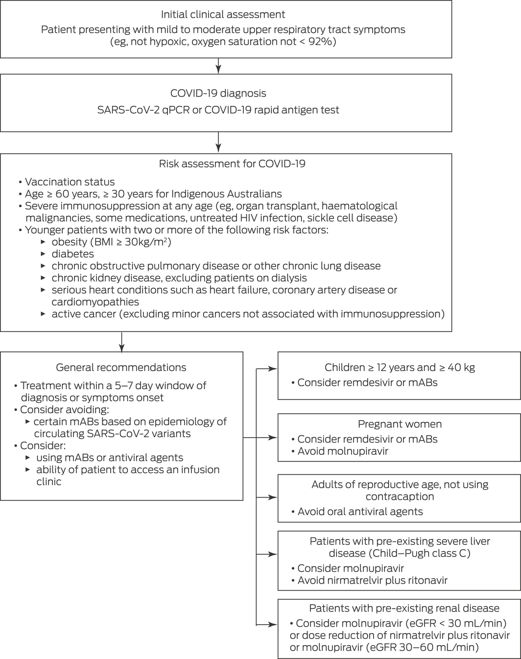 A simple COVID‐19 treatment algorithm is shown in Box 2. This algorithm is based on recommendations from the New South Wales Government Agency for Clinical Innovation as of 12 August 2022.56 Specific recommendations vary between Australian states and may change over time, so clinicians should refer to up‐to‐date approved guidelines for their own jurisdiction for early treatment of COVID‐19.14,57,58,59 Patients presenting with mild or moderate upper respiratory tract symptoms should be tested by polymerase chain reaction and/or a rapid antigen test to confirm SARS‐CoV‐2 positivity. A risk assessment for early treatment of COVID‐19 should consider a variety of patient factors, including current COVID‐19 vaccination status, age, presence of immunosuppression, and/or presence of other known risk factors for COVID‐19 progression (Box 2). It is recommended that treatment with most approved early COVID‐19 drugs begins within 5 days of symptom onset or COVID‐19 diagnosis, and that treatment with mABs and remdesivir begins within 7 days. As has already been discussed, the use and choice of mABs should be informed by knowledge regarding SARS‐CoV‐2 variants circulating in the community. Although certain COVID‐19 drug indications and contraindications are described in Box 2, we recommend referring to approved online resources for specific patient groups — these provide indications, contraindications and potential adverse effects of approved COVID‐19 medications and are updated in real time.14,57,58,59 In certain risk groups, prolongation of therapy is also recommended to reduce the risk of relapse of symptomatic COVID‐19.