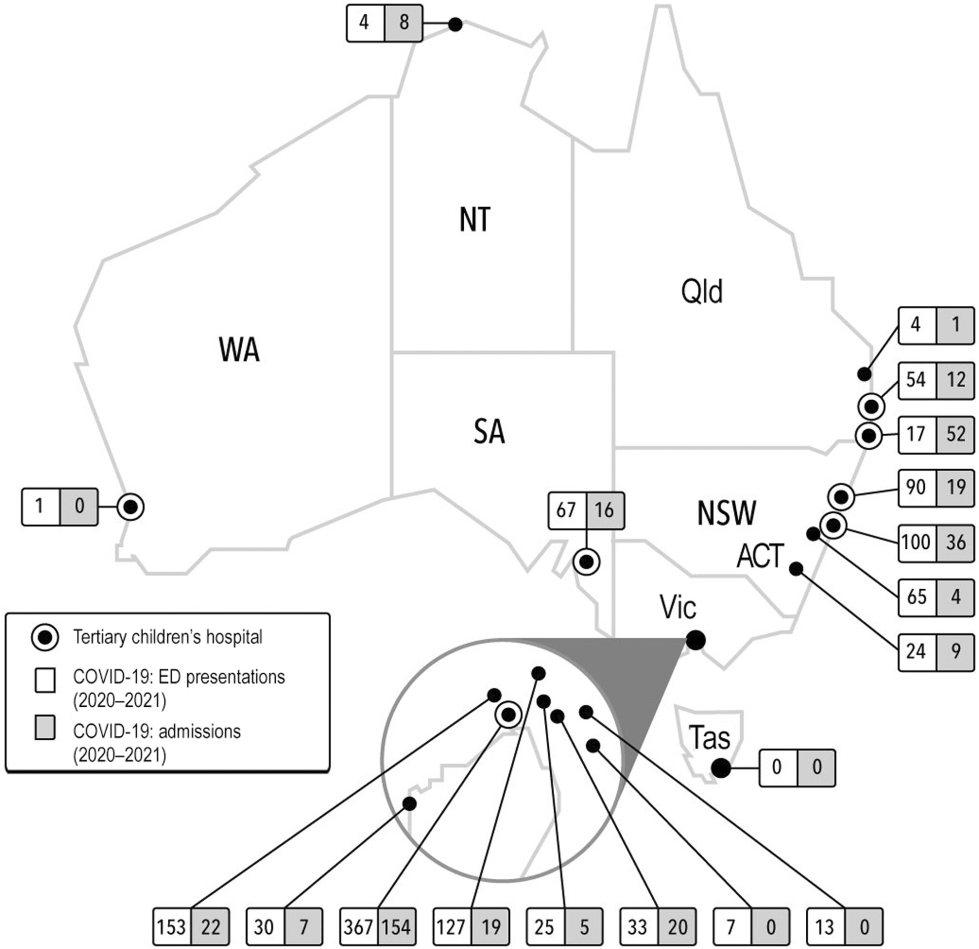 We limited our analysis to ED presentations and hospital admissions, rather than including all children who were positive for SARS-CoV-2. Further, we did not include children who received ambulatory or virtual care, about whom we have reported elsewhere.3 Care systems vary considerably between states. Virtual care in NSW and hospital-in-the-home care in Victoria are classified as neither emergency nor hospital admission care, making data capture and comparisons with other care types difficult. The number of ED and hospital presentations in NSW might have been lower because virtual care was available for thousands of children in this state.
