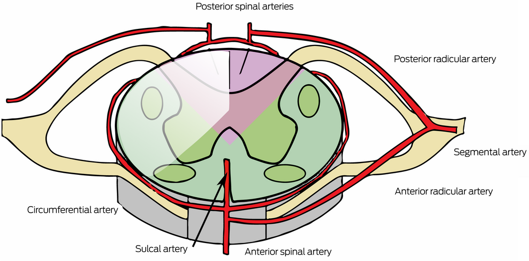 Spinal cord infarction is uncommon — estimated to account for only 1% of strokes.2 Although 11% of cord infarctions in one large series related to vertebral artery dissection, none of these was referrable to posterior spinal arteries, reflecting the rarity of this clinical syndrome.2 The posterior third of the cord — the site of the infarct in this case — is supplied by the single or paired posterior spinal arteries (Box), which arise from the distal vertebral arteries and are variably augmented in many vertebral segments by paired posterior radicular arteries.3 In this case, vertebral dissection is likely to have led to occlusion of the origin of the right posterior spinal artery and/or one or more high cervical posterior radicular branches. Cervical cord infarcts have the potential to cause significant disability.4 They should be considered in individuals presenting with neck pain or headache with ipsilateral neurological signs or symptoms. This case serves as a reminder that vertebral artery dissection and cervical cord infarction are diagnoses not to be missed.