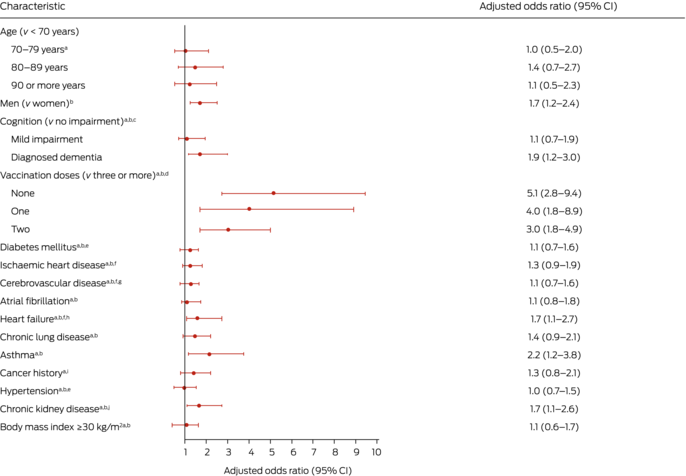 The new: In residential aged care residents with COVID‐19, hospitalisation was more likely for people with dementia, heart failure, chronic kidney disease, or asthma, and death for people with dementia, diabetes, heart failure, or chronic lung disease; the likelihood of each was greater for men and for residents who had not received three vaccine doses.