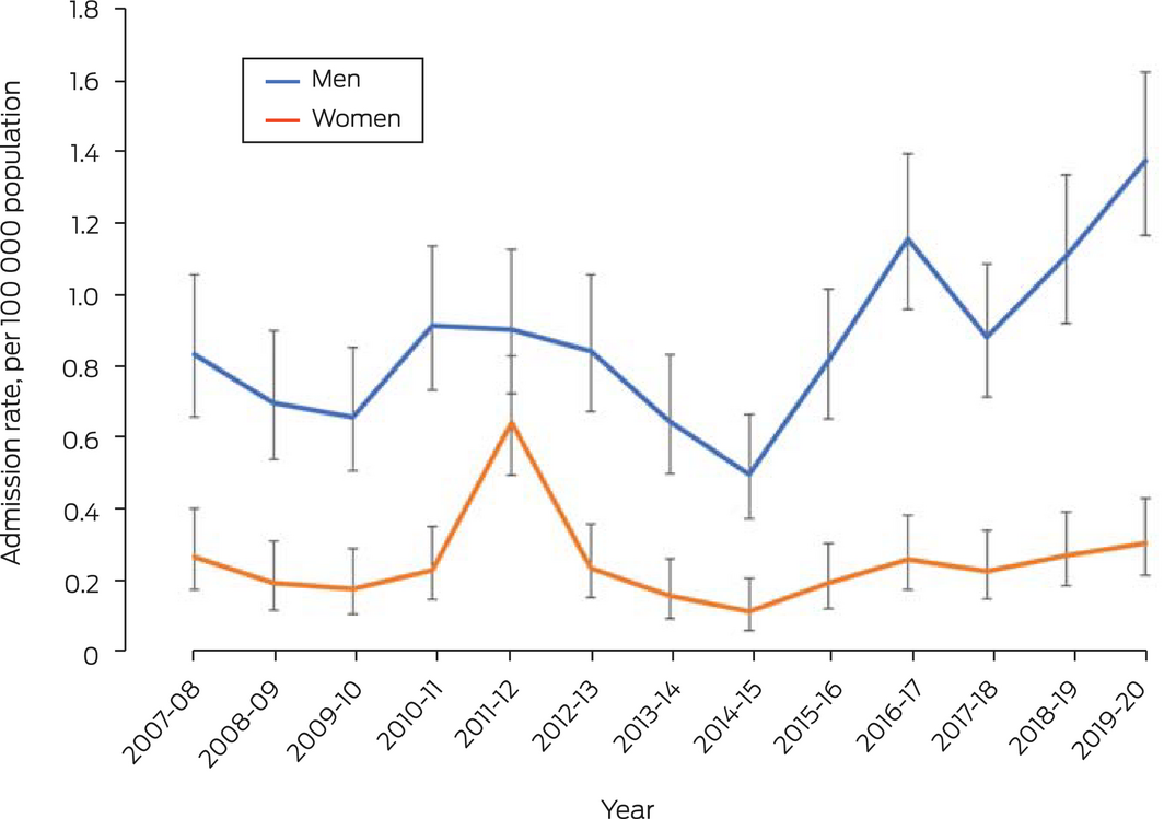 We analysed publicly available admissions data (Australian Institute of Health and Welfare National Hospital Morbidity database2) for people aged 15 years or more admitted to public and private Australian hospitals during 1 July 2007 – 30 June 2020 with neurosyphilis as the principal diagnosis (International Classification of Diseases, tenth revision, Australian modification codes A52.1 or A52.3). We calculated the annual admission rate by financial year and sex (based on Australian Bureau of Statistics population data3), and estimated the incident rate ratio (IRR) with 95% confidence interval (CI) for the study period. In subgroup analyses, we estimated admission rates for people of reproductive age (15–50 years) by sex, and separately assessed more recent changes in admission rates (2014–20). We used Independent Hospital Pricing Authority (IHPC) data on acute hospital care4 to estimate costs (mean cost per admission day, $1271 to $2223; further details: Supporting Information). The Alfred Hospital Ethics Committee approved the study (project 97/22).