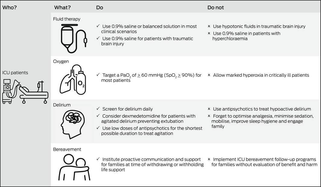 Global interest in the management of critically ill patients has increased significantly with the coronavirus disease 2019 (COVID‐19) pandemic. This Perspective article focuses on recent advances in four key aspects of critical care that are relevant to a broad range of clinicians including those who do not practise in an intensive care unit (ICU): intravenous fluid therapy, supplemental oxygen, management of delirium, and follow‐up care of bereaved family members (Box).