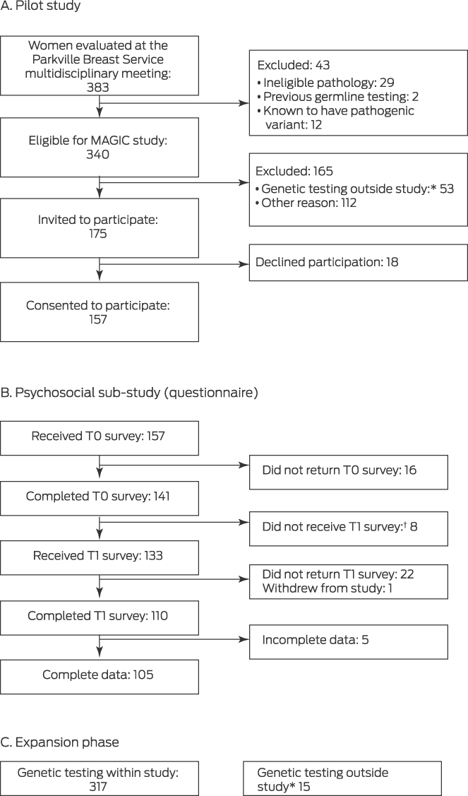 Design, setting, participants: Prospective study of women with invasive or high gradein situ breast cancer and unknown germline status discussed at the Parkville Breast Service (Melbourne) multidisciplinary team meeting. Women were recruited to the pilot (12 June 2020 – 22 March 2021) and expansion phases (17 October 2021 – 8 November 2022) of the Mutational Assessment of newly diagnosed breast cancer using Germline and tumour genomICs (MAGIC) study.