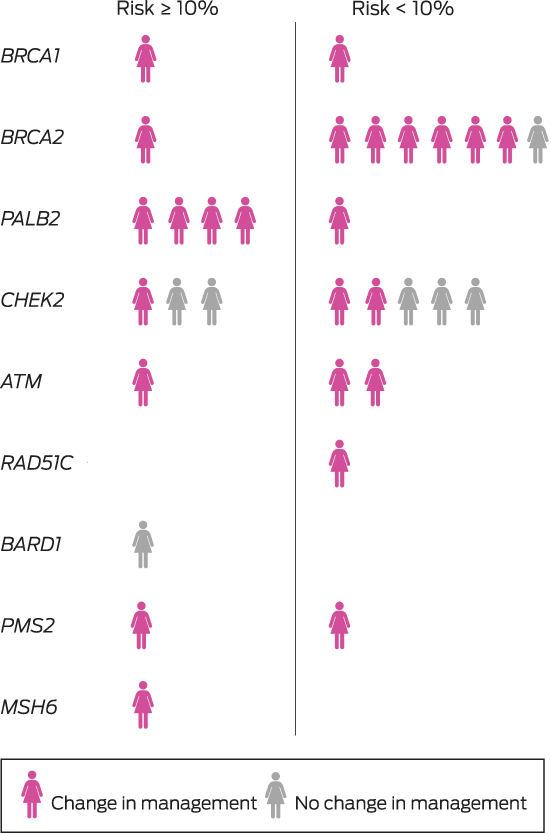 The multidisciplinary team modified their treatment recommendations for 24 of the 31 women with pathogenic variants (77%), including fourteen of the eighteen not eligible for Medicare‐funded testing (Box 3; , table). The modified recommendations included consideration of contralateral or bilateral mastectomy for fifteen women. Eighteen were referred for consideration of risk‐reducing bilateral salpingo‐oophorectomy (and hysterectomy for women with PMS2 and MSH6 variants), and three women with pathogenic ATM variants were closely monitored for radiation toxicity.
