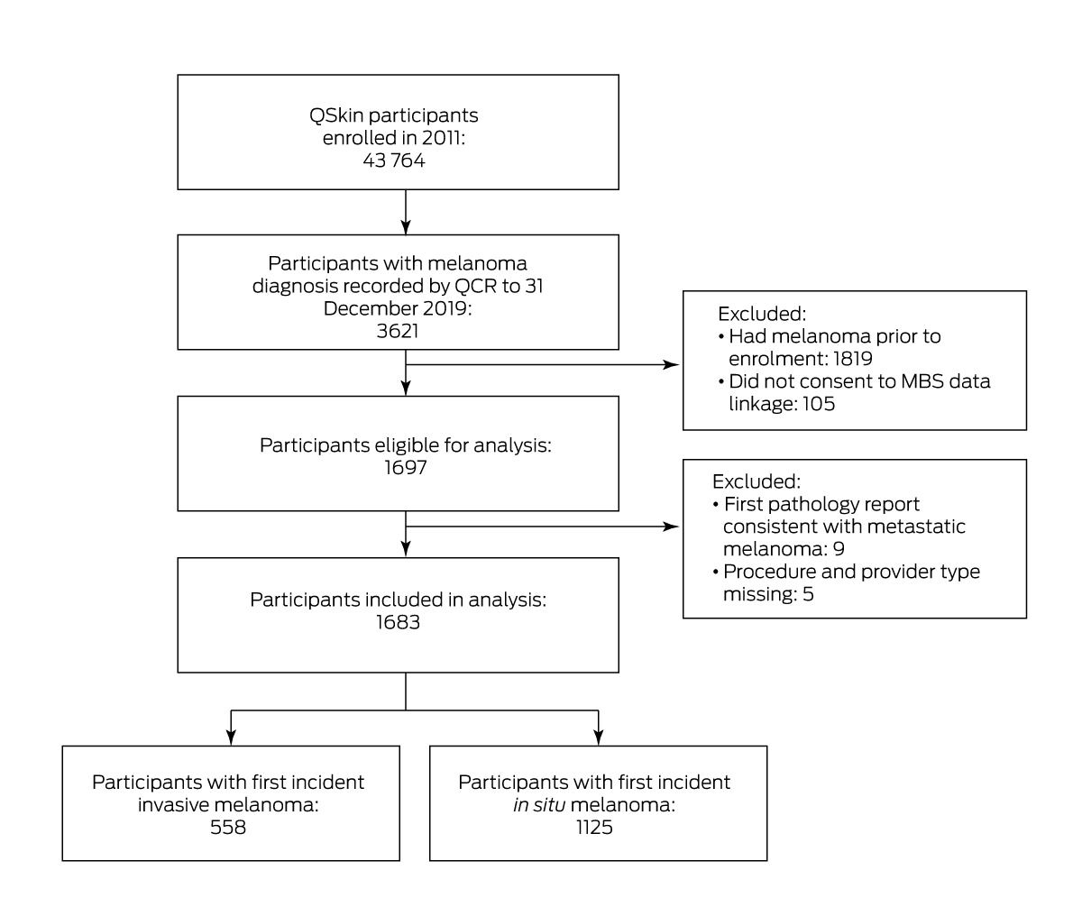 The strengths of our study include its prospective design, the population‐based sampling frame, and complete ascertainment of incident, histologically verified melanoma diagnoses (including melanoma in situ) through linkage with QCR data, cross‐referenced with MBS claims data (including second and subsequent episodes of care for the same tumour). Limitations included missing data on diagnostic procedures for 38 melanomas. While the baseline characteristics of the QSkin study cohort (23% of people invited to participate did so14) were similar to those of the general Queensland population, the mean age of participants (56 v 52 years) and the proportion of women (59% v 55%) were slightly higher than for people who declined to participate. Excluding the 5.8% of otherwise eligible participants from our analysis who did not consent to MBS data linkage may have influenced our findings, but the effect would be small.