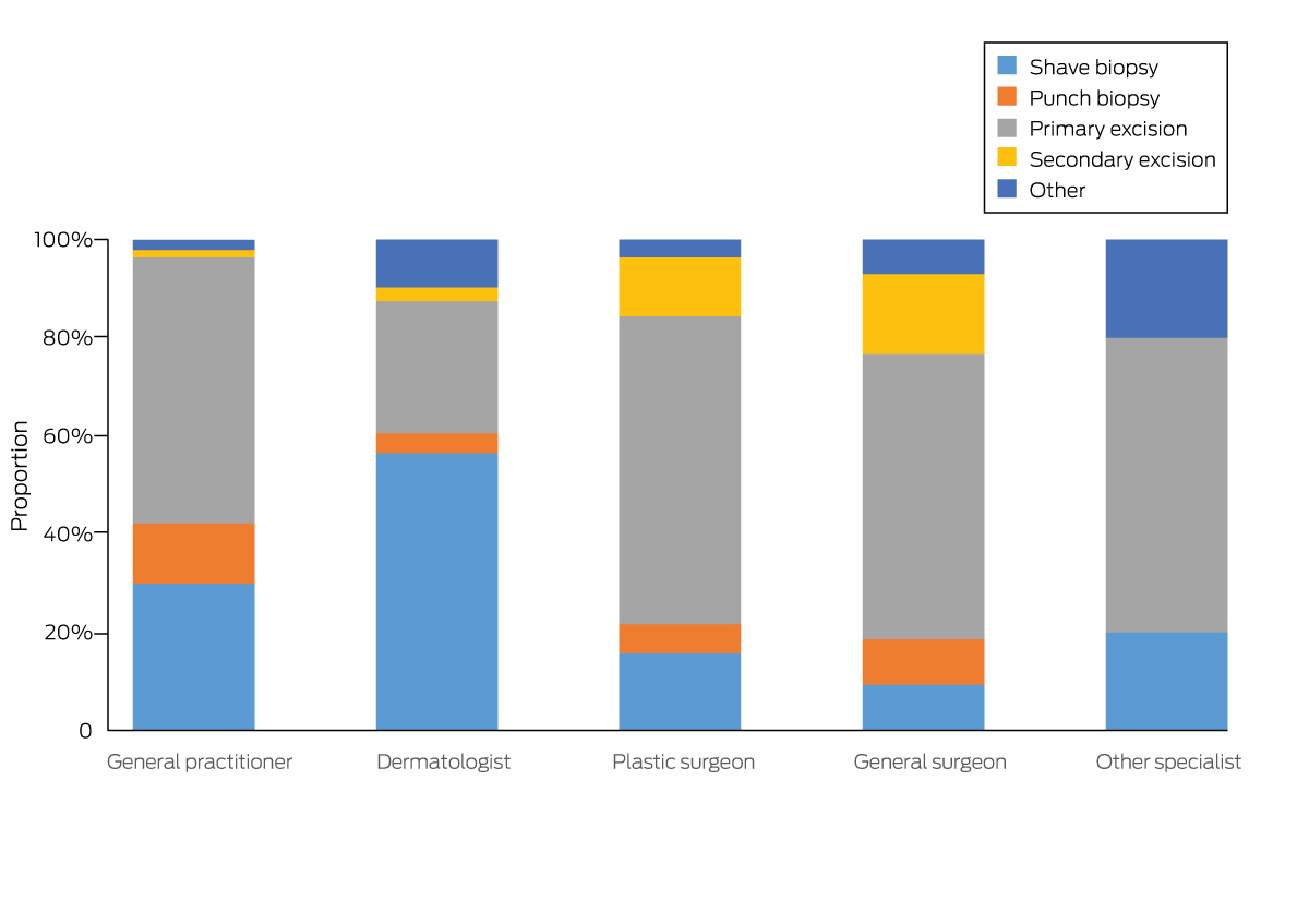 Australian clinical guidelines recommend that people who present with suspicious pigmented lesions be promptly assessed by a primary care practitioner, by undertaking an excisional biopsy or referring them to a specialist.6,7,8 Primary care practitioners are therefore at the forefront of melanoma care, but information regarding diagnosis and treatment patterns in Australia is limited. Medical Benefits Schedule (MBS) reimbursement data indicate that 49% of melanomas diagnosed during 2013–14 had been excised by general practitioners, 34% by surgeons, and 16% by dermatologists.9 This analysis, however, was restricted to reimbursement claims for excisions of definitive melanoma, and did not include other procedures (such as shave or punch biopsy) often employed by Australian practitioners to establish a diagnosis of melanoma.10