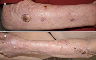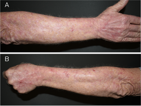 Box 1 – Actinic damage bilateral forearms before radiatiotherapy (A, right forearm; B, left forearm)