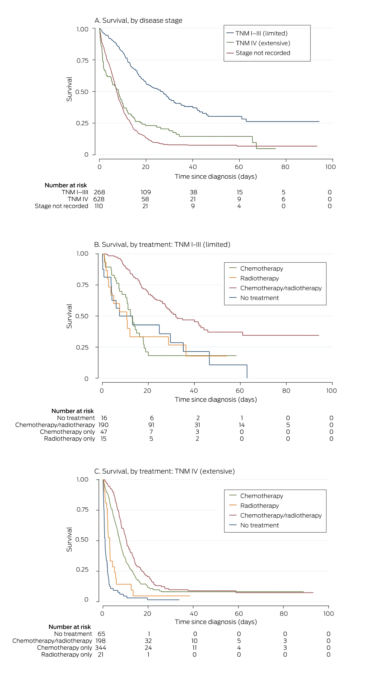 Results: During 2011–19, 1006 people were diagnosed with SCLC (10.5% of all lung cancer diagnoses in Victoria); their median age was 69 years (interquartile range [IQR], 62–77 years), 429 were women (43%), and 921 were current or former smokers (92%). Clinical stage was defined for 896 people (89%; TNM stages I–III, 268 [30%]; TNM stage IV, 628 [70%]) and ECOG performance status at diagnosis for 663 (66%; 0 or 1, 489 [49%]; 2–4, 174 [17%]). The cases of 552 patients had been discussed at multidisciplinary meetings (55%), 377 people had received supportive care screening (37%), and 388 had been referred for palliative care (39%). Active treatment was received by 891 people (89%): chemotherapy, 843 (84%); radiotherapy, 460 (46%); chemotherapy and radiotherapy, 419 (42%); surgery, 23 (2%). Treatment had commenced within fourteen days of diagnosis for 632 of 875 patients (72%). Overall median survival time from diagnosis was 8.9 months (IQR, 4.2–16 months; stage I–III: 16.3 [IQR, 9.3–30] months; stage IV: 7.2 [IQR, 3.3–12] months). Multidisciplinary meeting presentation (hazard ratio [HR], 0.66; 95% CI, 0.58–0.77), multimodality treatment (HR, 0.42; 95% CI, 0.36–0.49), and chemotherapy within fourteen days of diagnosis (HR, 0.68; 95% CI, 0.48–0.94) were each associated with lower mortality during follow‐up.