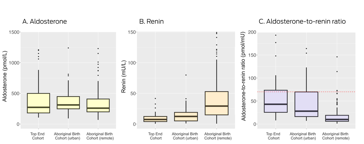 The aldosterone and renin test kits were provided by DiaSorin. The Aboriginal Birth Cohort study is funded by an National Health and Medical Research Council project grant (APP1138609). Jun Yang is supported by an NHMRC Investigator Grant. Morag J Young is supported by an Alice Baker and Eleanor Shaw Gender Equity Fellowship. Elisabeth Ng is supported by an NHMRC and Heart Foundation PhD Scholarship and a Royal Australasian College of Physicians Vincent Fairfax Family Foundation Research Entry Scholarship. The Hudson Institute of Medical Research and Baker Heart and Diabetes Institute are supported by the Operational Infrastructure Scheme of the Victorian government. Funders did not have any role in study design, data collection, analysis or interpretation, reporting or publication. We acknowledge Monash Pathology for determining plasma aldosterone and direct renin concentrations.