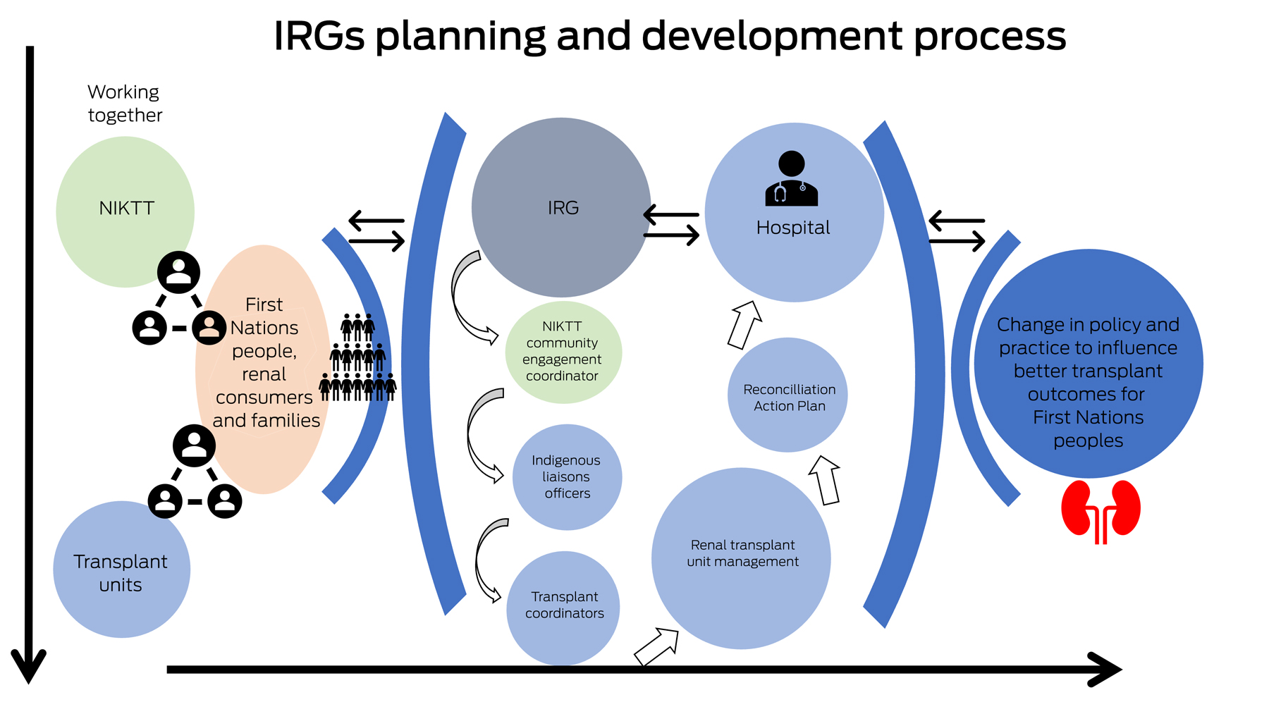 The barriers that Aboriginal and Torres Strait Islander peoples face when contending with renal services are numerous, as discussed elsewhere in this supplement. The kidney transplant pathway has aptly been described by one Aboriginal patient as “fragmented, confusing, isolating, and burdensome”.10 In order to address some of these barriers, through authentic engagement with consumers, the NIKTT catalysed the establishment of Indigenous Reference Groups (IRGs) within transplantation units around Australia. Five transplantation units were initially selected to host these IRGs — these represented the hospitals that serve the largest proportion of Aboriginal and Torres Strait Islander peoples on kidney replacement therapy: the Royal Adelaide Hospital (RAH) in South Australia, Princess Alexandra Hospital in Queensland, Westmead Hospital and the Royal Prince Alfred Hospital in New South Wales, and Sir Charles Gairdner Hospital in Western Australia.