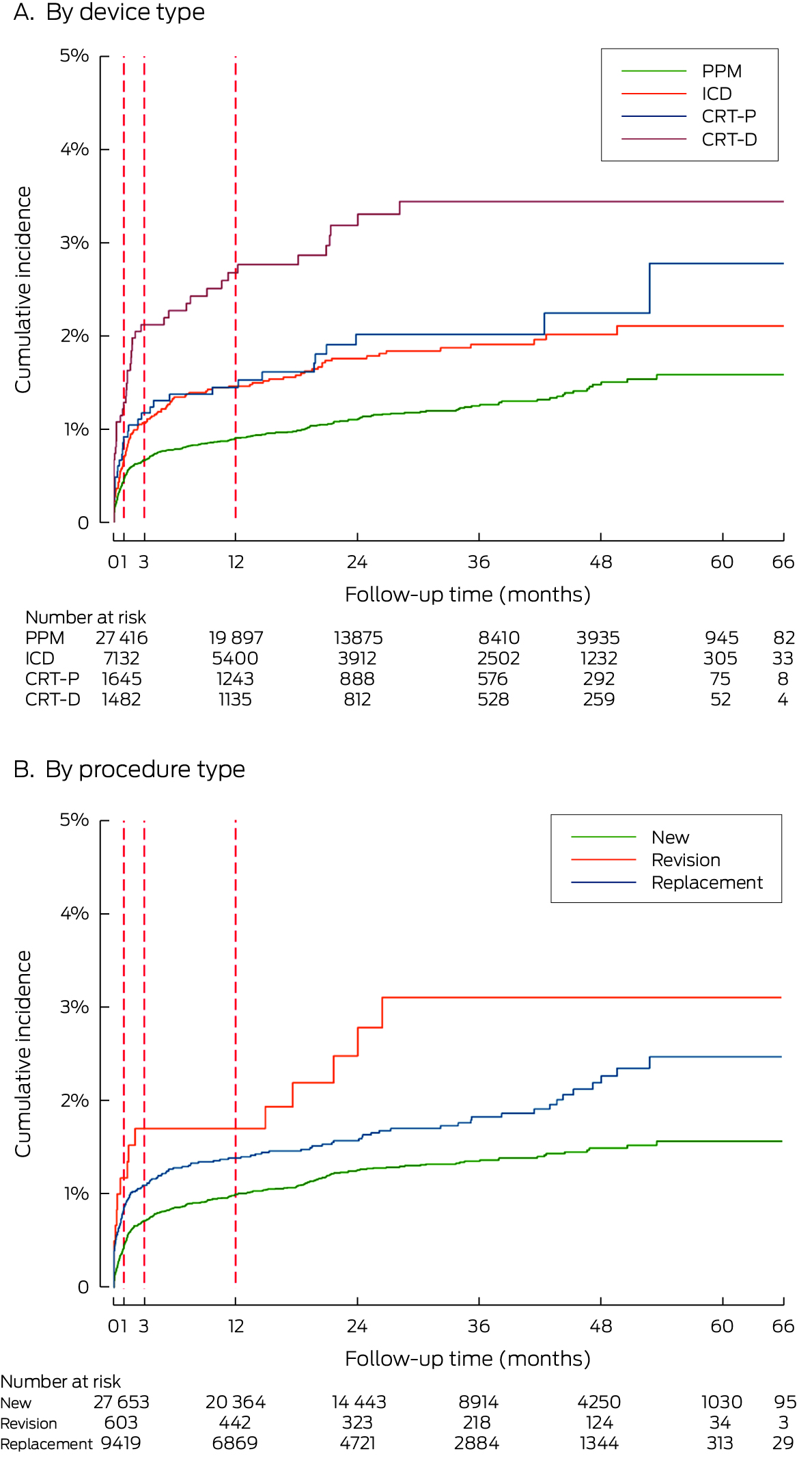 Results: Of 37 675 CIED procedures (23 194 men, 63.5%), 500 were followed by CIED‐related infections (median follow‐up, 24.9 months; interquartile range, 11.2–40.8 months), including 397 people (1.1%) within twelve months of their procedures, and 186 of 10 540 people (2.5%) at high risk of such infections (replacement or upgrade procedures; new cardiac resynchronisation therapy with defibrillator, CRT‐D). The overall infection rate was 0.50 (95% confidence interval [CI], 0.45–0.54) per 1000 person‐months; it was highest during the first month after the procedure (5.60 [95% CI, 4.89–6.42] per 1000 person‐months). The risk of CIED‐related infection was greater for people under 65 years of age than for those aged 65–74 years (adjusted hazard ratio [aHR], 1.71; 95% CI, 1.32–2.23), for people with CRT‐D devices than for those with permanent pacemakers (aHR, 1.46; 95% CI, 1.02–2.08), for people who had previously undergone CIED procedures (two or morev none: aHR, 1.51; 95% CI, 1.02–2.25) or had CIED‐related infections (aHR, 11.4; 95% CI, 8.34–15.7), or had undergone concomitant cardiac surgery (aHR, 1.62; 95% CI, 1.10–2.39), and for people with atrial fibrillation (aHR, 1.33; 95% CI, 1.11–1.60), chronic kidney disease (aHR, 1.54; 95% CI, 1.27–1.87), chronic obstructive pulmonary disease (aHR, 1.37; 95% CI, 1.10–1.69), or cardiomyopathy (aHR 1.60; 95% CI, 1.25–2.05).