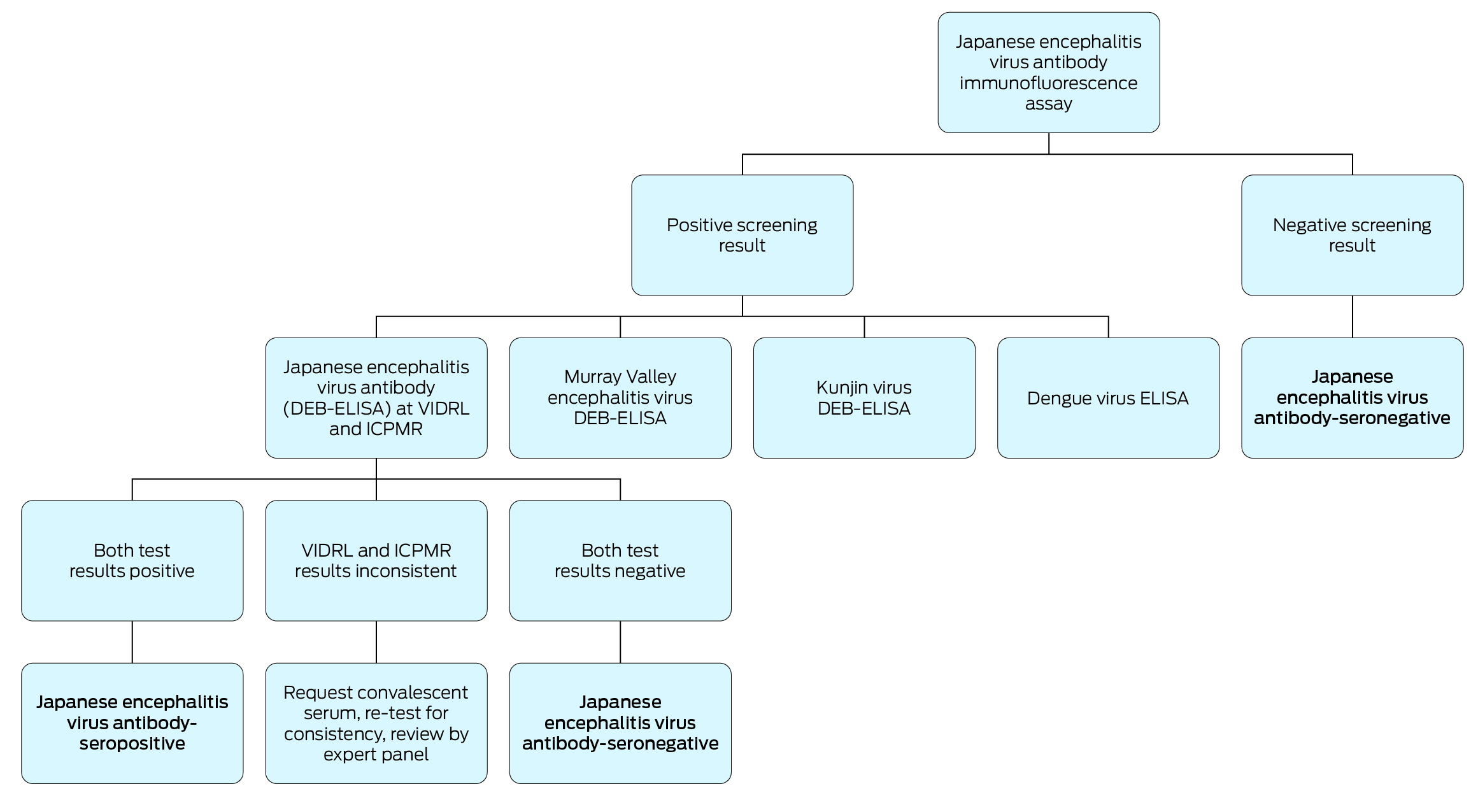 Box 2 – Testing algorithm for the serosurvey of the prevalence of antibodies to Japanese encephalitis virus and related flaviviruses in three Victorian local public health unit catchment areas, 8 August – 1 December 2022