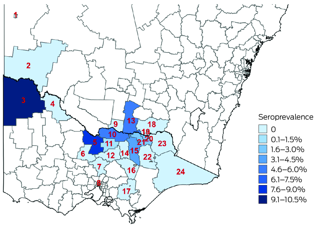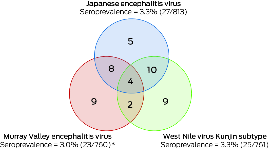 Two flaviviruses closely related to JEV, the Murray Valley encephalitis virus (MVEV) and the Kunjin subtype of the West Nile virus (KUNV), are endemic to Australia. Outbreaks of Murray Valley encephalitis were recorded in southern Australia in 1951, 1974, and 2011, but no human infections with MVEV were reported in Victoria during 2011.12 Following the detection of MVEV and KUNV in mosquitoes in Victoria in early 2023,13 we undertook additional retrospective testing of samples collected for our JEV antibody serosurvey to clarify interpretation of its results, to assess the seroprevalence of antibodies to MVEV and KUNV, and to inform public health actions.