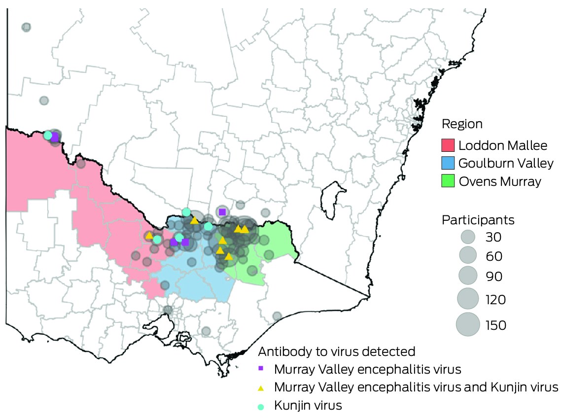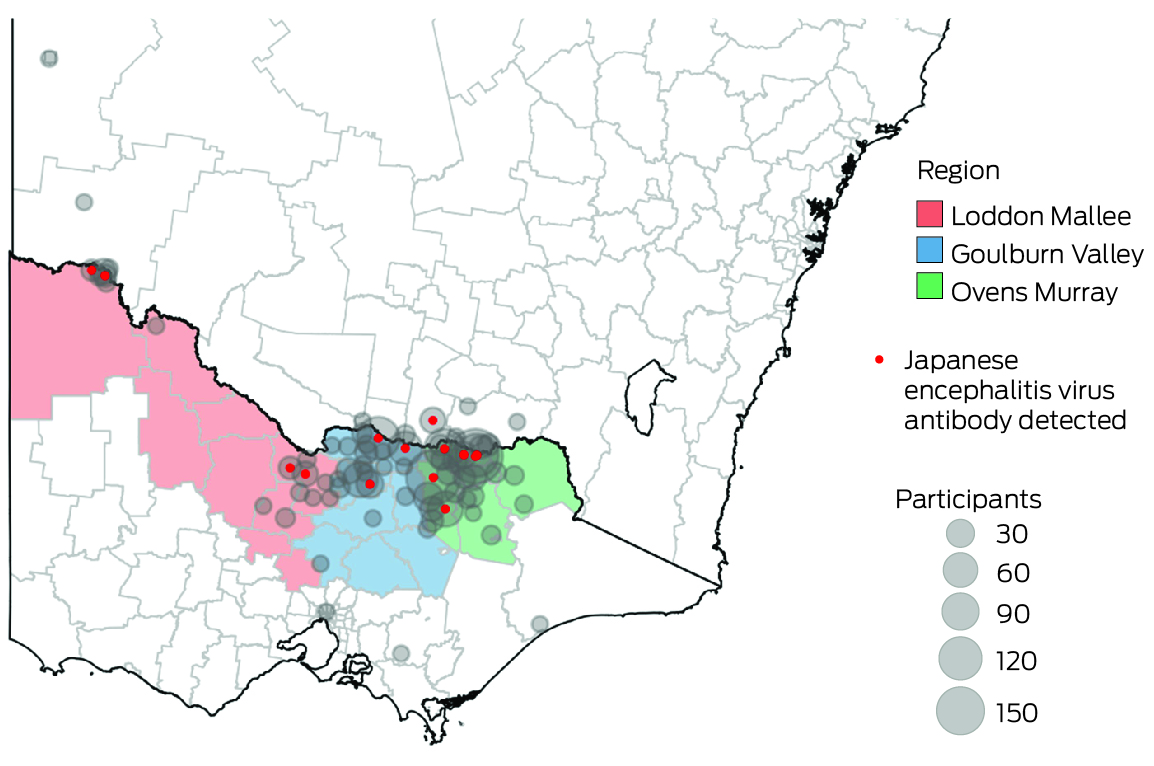 We recruited participants in the catchment areas of three Victorian local public health units (Ovens Murray, Goulburn Valley, Loddon Mallee; Box 1) during 8 August – 1 December 2022. People in these areas were deemed to be at high risk of JEV infection, based on the likely locations of exposure of people who had been diagnosed with Japanese encephalitis, the locations of piggeries with infected animals, and detections of JEV‐positive mosquitoes during the 2022 outbreak. We undertook both opportunistic recruitment of people from whom blood was collected at participating pathology centres for other purposes, as well as targeted recruitment of people less likely to be reached in this manner (eg, younger men) by community outreach (phone call or email, at meetings with community groups), and through radio, newspaper, and social media advertisements.