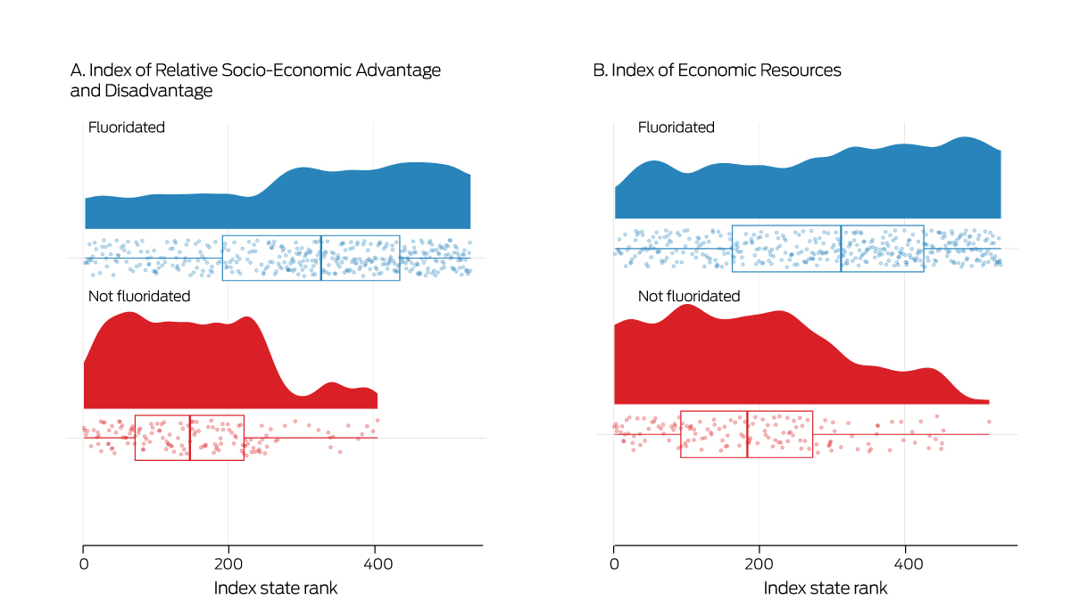 * The rainfall plots (solid graphs) depict the relationship between access to fluoridated water by SA2 and Index of Relative Socio‐Economic Advantage and Disadvantage or Index Economic Resources ranking. The raincloud plot is a histogram for the index stratified by fluoridation status. Each individual SA2 is indicated by a raindrop, the overlayed boxes mark the interquartile range of values, with the median included as the internal line, and whiskers indicate the data range.