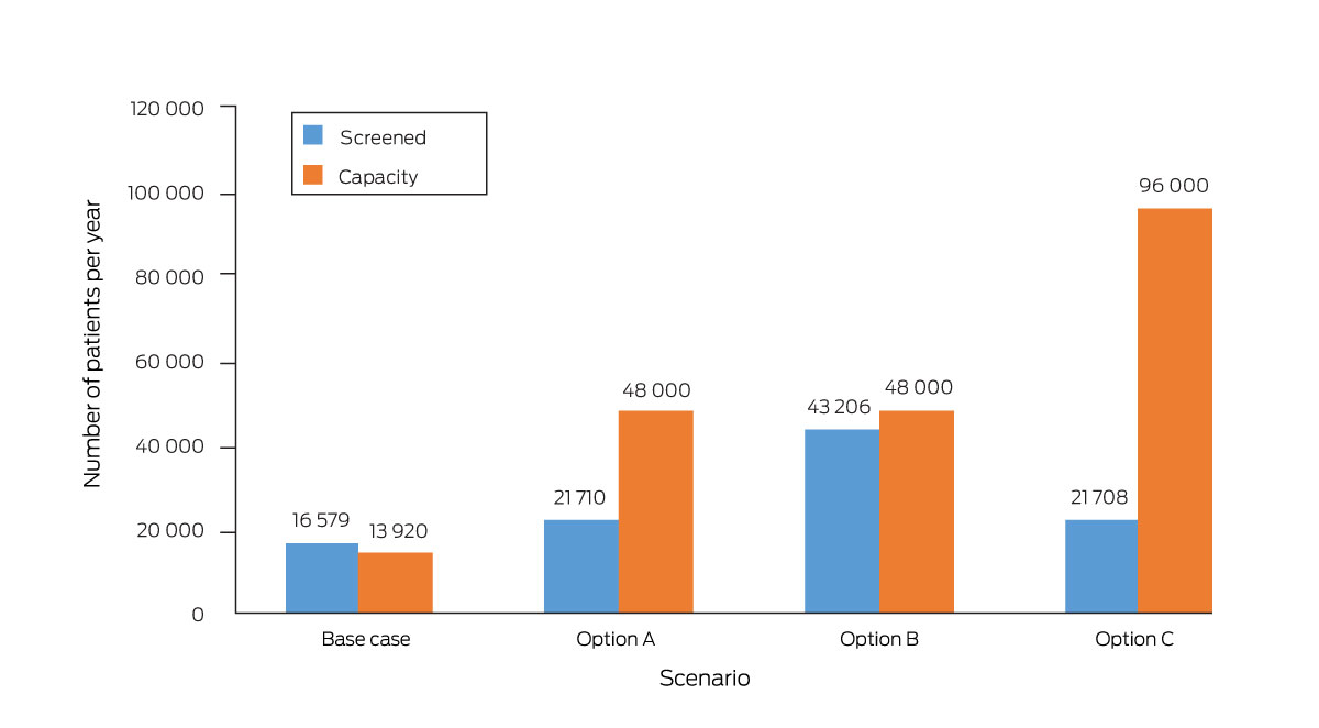 * Base case: 29 fracture liaison services, 30% screening rate, capacity to see 40 new patients each month. Option A: 100 fracture liaison services, 30% screening rate, capacity to see 40 new patients each month. Option B: 100 fracture liaison services, 60% screening rate, capacity to see 40 new patients each month. Option C: 100 fracture liaison services, 30% screening rate, capacity to see 80 new patients each month. The total number of people managed by fracture liaison services would be the lower of the number screened and the service capacity.