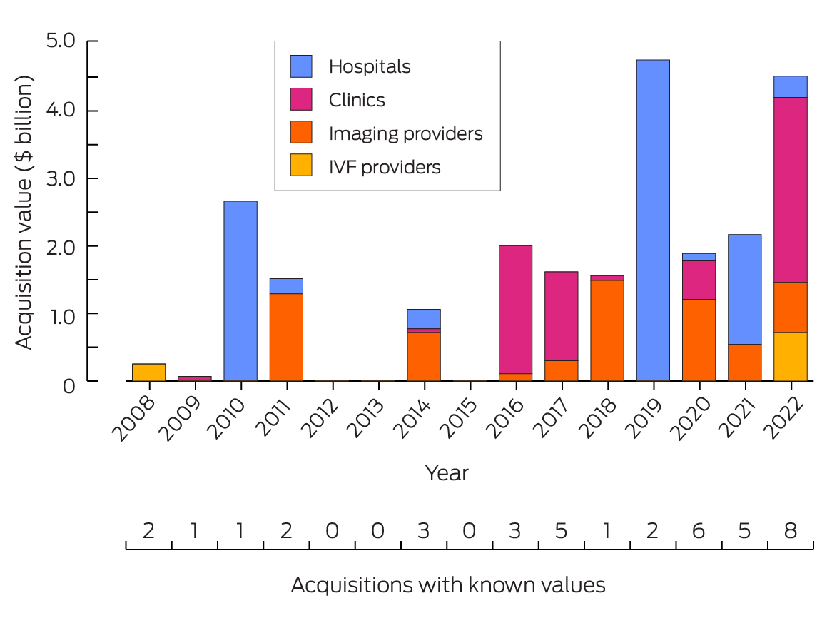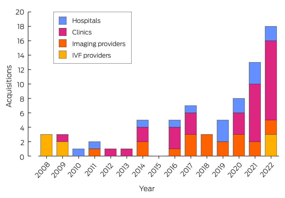 Study design, setting: Extraction of information about private equity acquisitions of hospitals, clinics, imaging centres and in vitro fertilisation facilities in Australia, 2008–2022, from a commercial database (PitchBook), supplemented by information from publicly available online media sources.