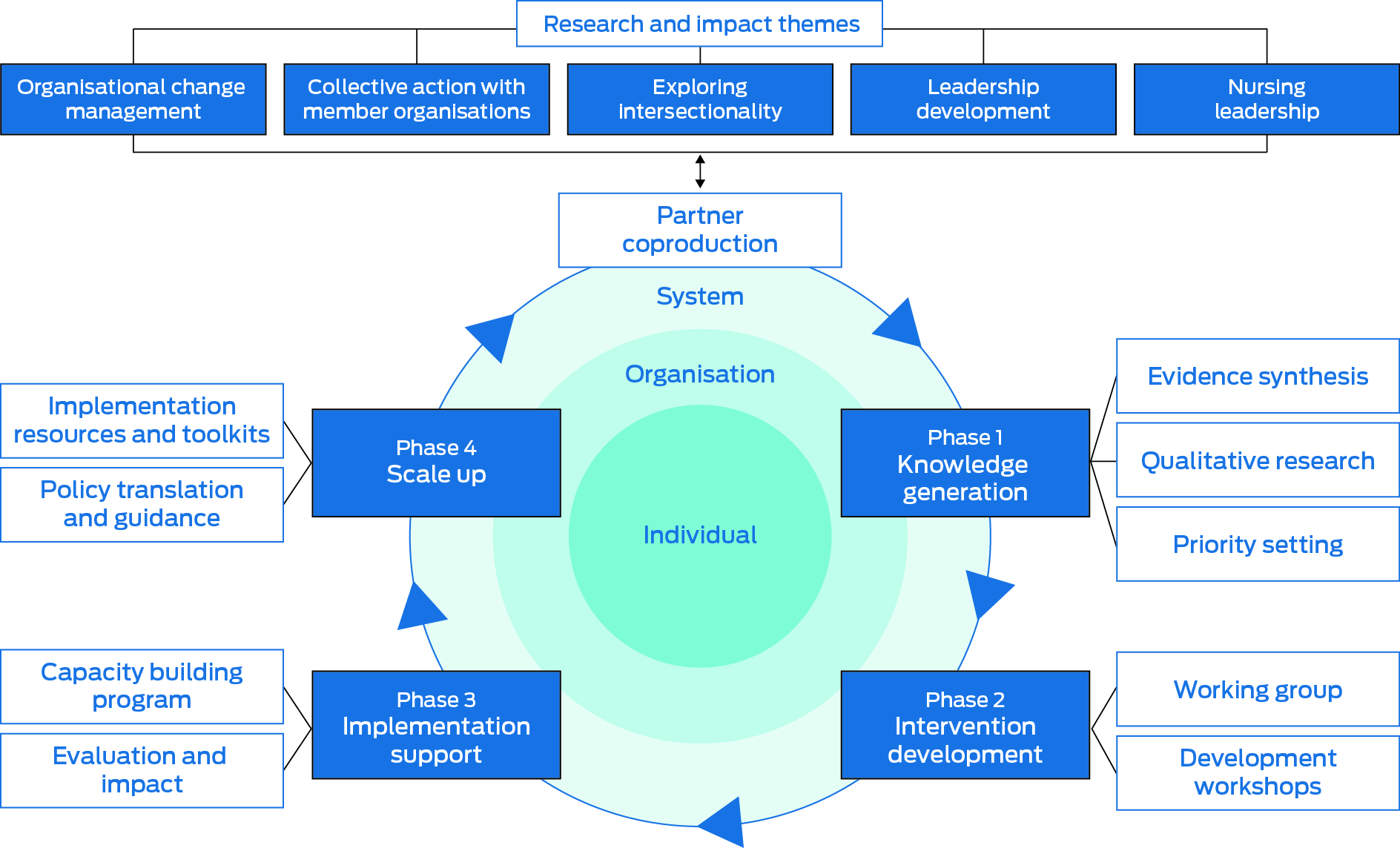 The burden of addressing barriers on a woman's path to leadership16 should not sit with individuals but rather with changing the culture, organisations and systems where women work.17 The Advancing Women in Healthcare Leadership (AWHL) initiative focuses on this system‐level change. Funded by the National Health and Medical Research Council (NHMRC) and partner contributions, AWHL integrates health services, policy makers, professional colleges and member organisations with cross‐sector academic expertise. It aims to deliver coproduced, evidence‐based organisational and systems change to have an impact on the workplaces and systems where women work, enabling career goal attainment (Box 1).