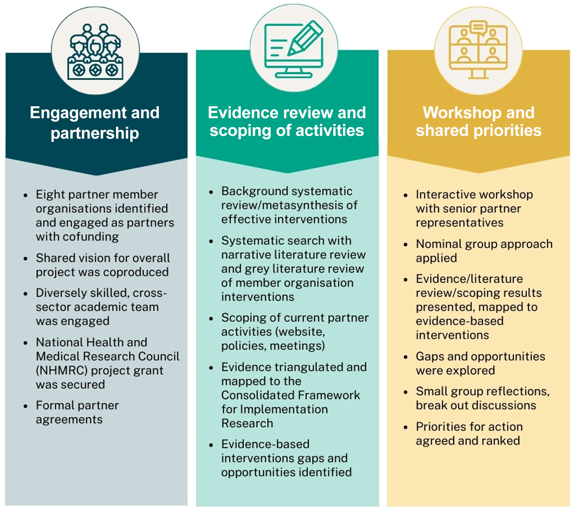 The phases of formative research for this national initiative are outlined in Box 2. The cross‐sector academic team engaged multiple stakeholders, including medical member organisations and colleges, with partnership involving cash and in‐kind contributions, matched in a nationally competitive grant by the NHMRC. Coproduction approaches were applied to explore, map, identify and prioritise the roles of partners within their organisations and across the broader health care sector. These relied on close collaboration with partner organisations, building trust and mutual respect across all stages, in their role as both knowledge generators and end users.