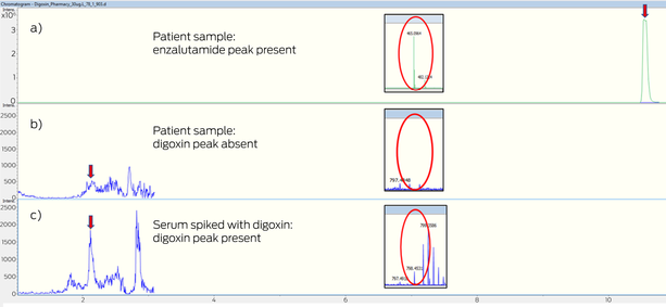 Box – Mass spectroscopy chromatogram: (a) patient plasma with enzalutamide peak with extracted ion chromatogram adduct (465 m/z); (b) in the same patient, plasma sample with undetectable digoxin peak, and undetectable digoxin ammoniated adduct at 798 m/z; and (c) plasma control sample spiked with digoxin (30 μg/L) with detected digoxin peak and extracted ion chromatogram digoxin ammoniated adduct (798 m/z)