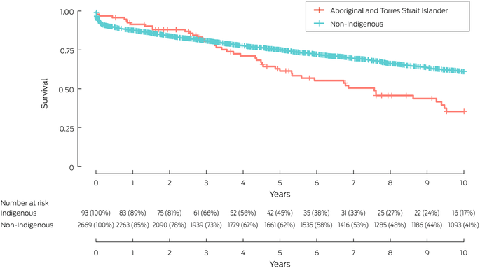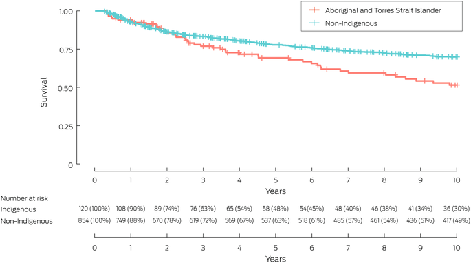 Survival was similar very early after transplant; however, it diverged from three years (Box 3). At five years, survival outcomes were 61% v 75%; (aHR, 1.43; 95% CI, 1.00–2.05) between Aboriginal and Torres Strait Islander and non‐Indigenous children and young adults. Ten‐year graft survival was lower for Aboriginal and Torres Strait Islander children and young adults (35% v 61%; aHR, 1.69; 95% CI, 1.25–2.28) (Box 3).
