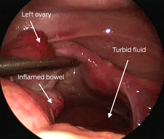 An abdominal ultrasound scan was reported as “suggestive for acute appendicitis”. The patient underwent diagnostic laparoscopy and appendicectomy. Intra‐operatively, the appendix appeared normal; however, throughout the abdomen there was turbid fluid and multiple fibrin deposits. The fallopian tubes and ovaries were erythematous (Box) but an intra‐operative gynaecological review yielded no concern for pelvic inflammatory disease. In/out catheterisation pre‐operatively drained urine with sediment, pus and blood and was again sent for microscopy and culture.