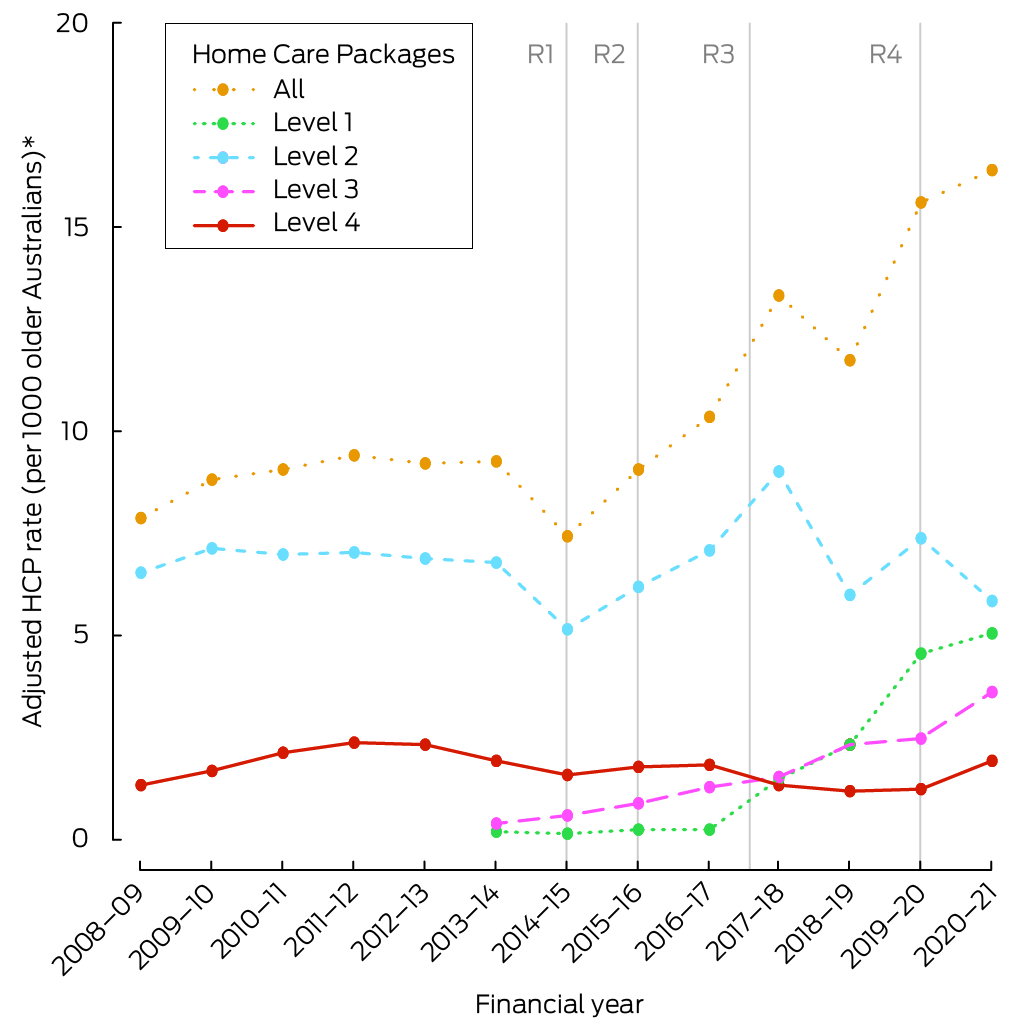 * The four‐level HCP system was introduced on 1 July 2013. R1 = reform 1 (income testing); R2 = reform 2 (consumer‐directed care); R3 = reform 3 (increasing choice); R4 = reform 4 (improving home care pricing information). Prior to 2013–14, Community Aged Care Packages were equivalent to the level 2 HCPs, Extended Aged Care at Home packages to level 4 HCPs.
