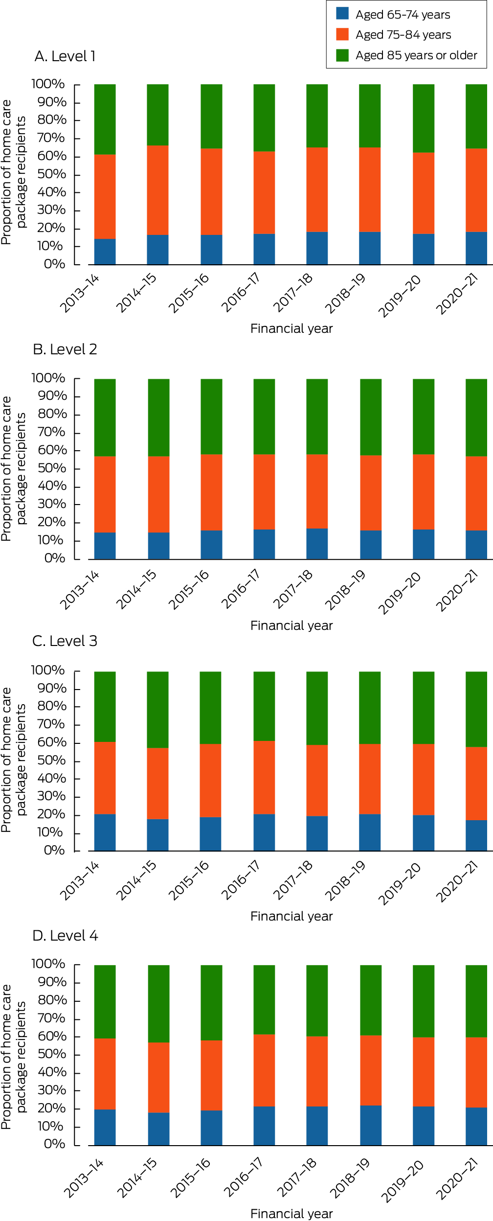 Results: A total of 490 276 HCPs were provided during 2008–21. The age‐ and sex‐standardised HCP rate rose from 9.23 per 1000 people aged 65 years or more in 2013–14 to 16.4 per 1000 older people in 2020–21. The increases in age‐ and sex‐standardised HCP rate between 2013–14 and 2020–21 were greatest for level 1 (from 0.19 to 5.05 per 1000 older people) and level 3 HCPs (from 0.35 to 3.62 per 1000 older people); the rate for level 2 HCPs declined from 6.75 to 5.82 per 1000 older people, and that for level 4 HCPs did not change. The proportion of culturally and linguistically diverse recipients rose from 10.8% to 16.2%; the overall proportion of recipients living outside major cities rose slightly, from 28.1% to 28.7%, but declined for higher care level HCPs (level 3: from 30.8% to 27.8%; level 4: from 29.6% to 25.2%). During 2018–19 to 2020–21, the proportions of lower level (1 and 2) HCPs generally exceeded demand, while the supply of higher level (3 and 4) HCPs generally fell short of demand.