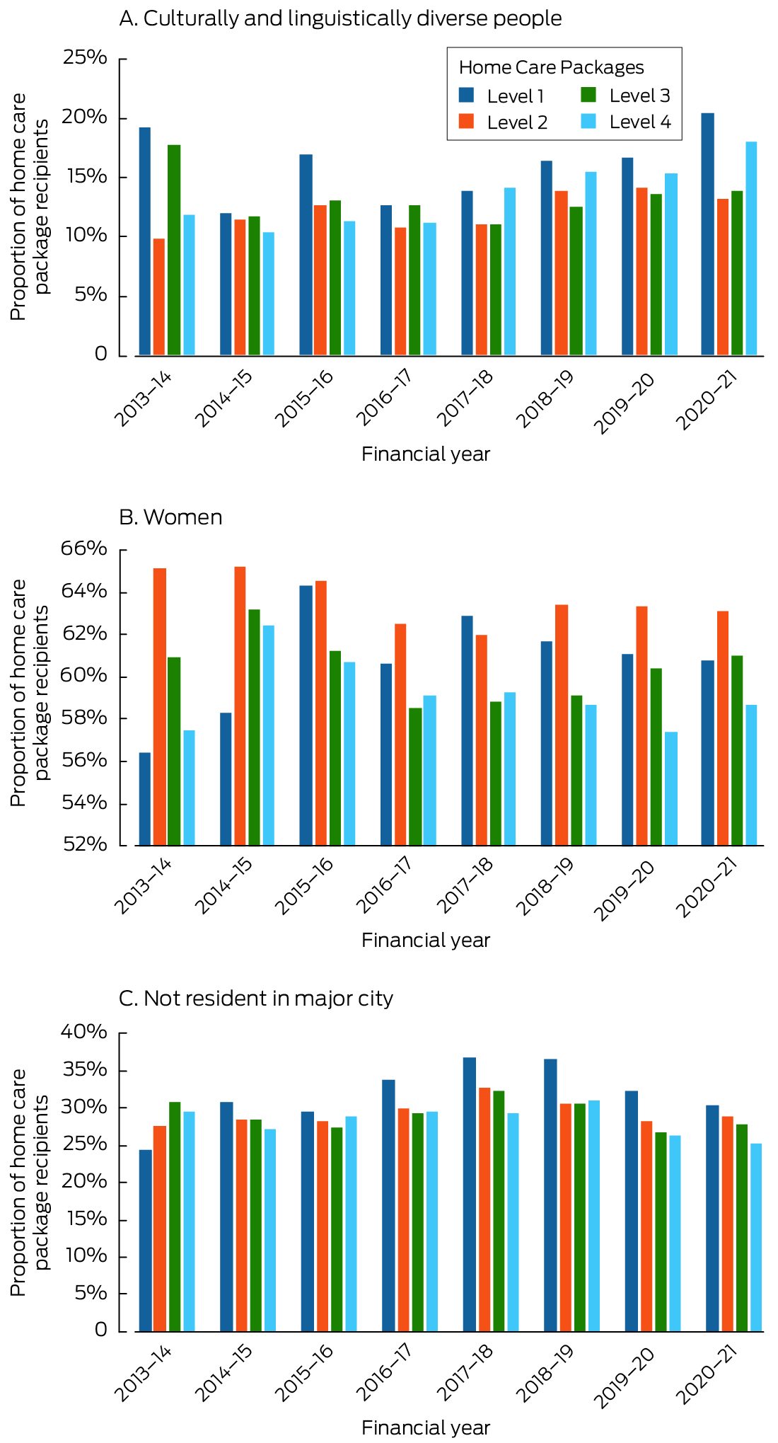 The proportion of HCP recipients aged 65–74 years increased from 16.0% in 2013–14 to 17.8% in 2020–21, the proportion aged 75–84 years was similar in both years (41.9% v 42.0%), and the proportion aged 85 years or older declined from 42.1% to 40.2% (Box 2, Box 3). The proportion of women declined from 63.2% to 61.5%, that of culturally and linguistically diverse recipients rose from 10.8% to 16.2%, and the proportion of recipients living outside major cities rose slightly, from 28.1% to 28.7% (Box 2, Box 4). The proportion of recipients living outside major cities increased for lower care levels between 2013–14 and 2020–21 (level 1, from 164 of 669, 24.5% to 6385 of 20 997, 30.4%; level 2: from 6296 of 22 766, 27.7% to 6930 of 24 038, 28.8%), but declined for higher care level HCPs (level 3, from 367 of 1191, 30.8% to 4165 of 14 973, 27.8%; level 4: from 1922 of 6493, 29.6% to 2007 of 7959, 25.2%) (age‐ and sex‐standardised rates: Supporting Information, table 5). The distribution pattern for recipients living outside major cities (increased shares of lower care levels and reduced shares of higher care levels) was also evident for HCPs in aged care planning regions in the socio‐economically most disadvantaged quintile (Supporting Information, figure 1 and table 6).