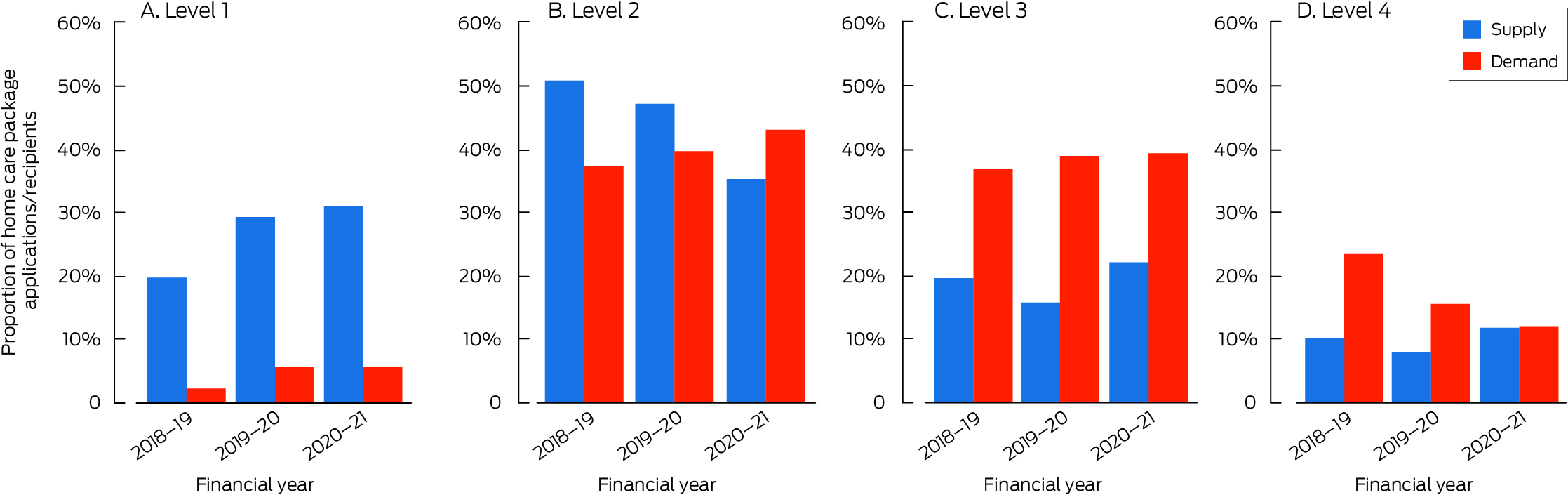 * Supply = HCPs provided at a care level as proportion of all HCPs provided; demand = number of people waiting for HCPs at a care level as proportion of all people waiting for HCPs. The required data were available only for 2018–19 to 2020–21. The data for this graph are included in the Supporting Information, table 7.