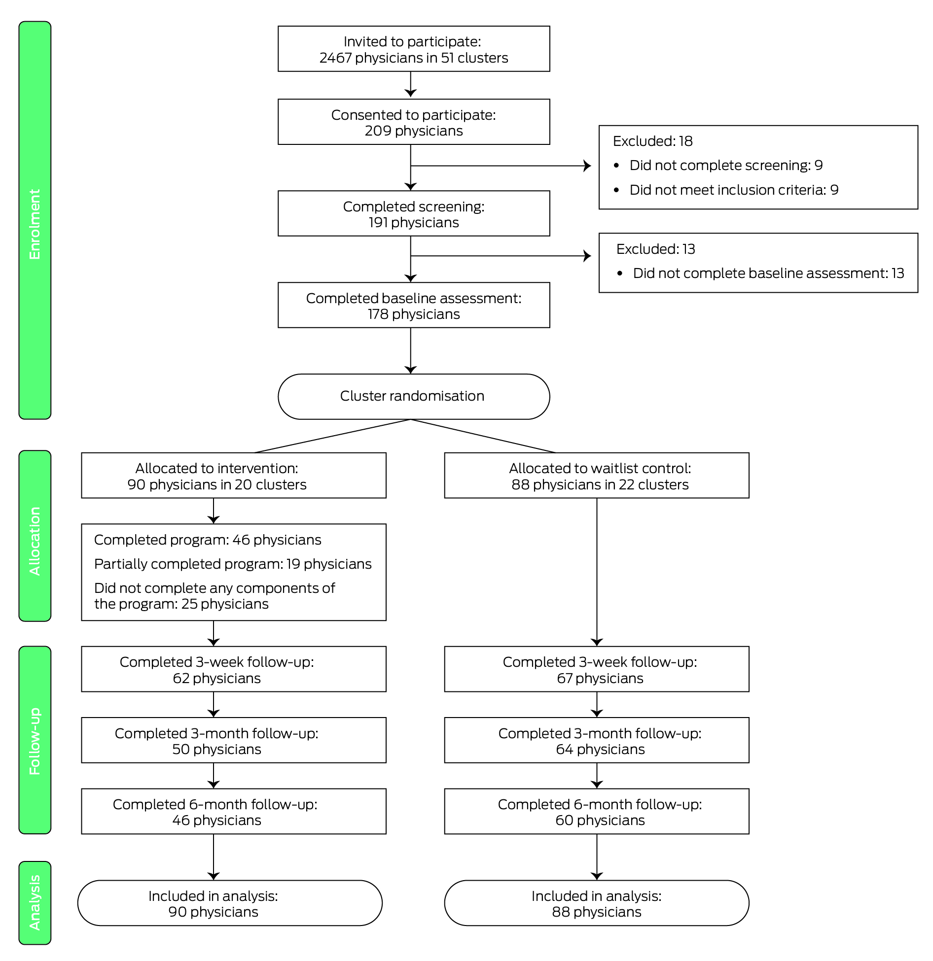 The proportions of participants who did not fully complete the post‐training/3‐week questionnaire were similar for the intervention (28 physicians, 31%) and control groups (21 physicians, 24%; P = 0.28); the proportions who did not fully complete the 3‐month (41 physicians, 46% v 26 physicians, 30%; P = 0.035) and 6‐month assessments (44 physicians, 49% v 28 physicians, 32%; P = 0.021) were larger for the intervention than the control group (Box 1). No harm or unintended effects during the trial were reported.