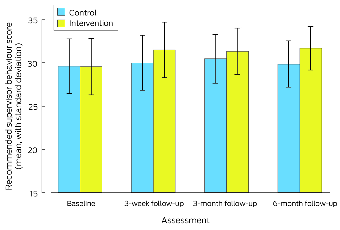 The low participation rate meant that our trial included a small sample of the population of physician supervisors, and interest in mental health may have motivated participation, increasing the risk of selection bias. Although the program examined could be implemented on a larger scale in other areas of health care, the focus in our trial may limit the generalisability of our findings. Further, we assessed physicians’ self‐reported behaviour, which may be prone to reporting bias and not accurately reflect behaviour as experienced by their residents. In addition, the supervisor relationship in hospitals is often transient, and reporting structures for resident physicians are often complex and multidisciplinary. The responsibility of dealing with health problems may rest with supervising physicians, or with other key persons overseeing physician trainees, including directors of training and senior resident physicians. While our planned sample size was initially achieved, eighteen participants were excluded before the baseline survey, the level of intra‐cluster correlation in manager behaviour was greater than anticipated on the basis of trials in other occupational groups.15 While degrees of coalescence in behaviour in different occupations is not surprising, the combined effect was to reduce the statistical power of our study and to increase the risk of type 2 error. Finally, the selected timeframe for assessments seemed sufficient for detecting changes, albeit small, across the follow‐up period; how long the changes were sustained beyond this point, however, is unknown. More than half the intervention group completed the program; this participant adherence rate, although lower than for face‐to‐face training, was within the range of 50–70% adherence rates reported for other online mental health interventions,23 and illustrates one problem in successfully implementing workplace training online.
