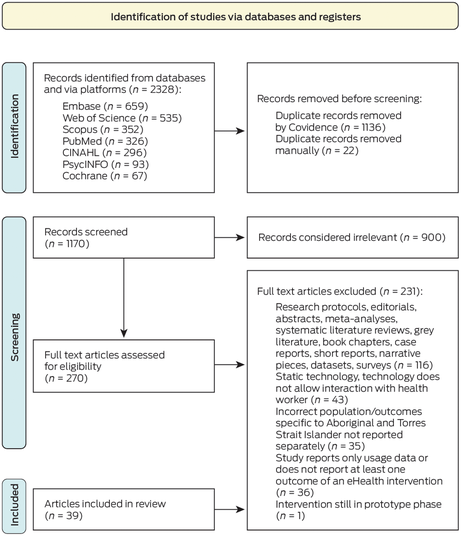We conducted searches directly via electronic databases or Web of Science and EBSCOhost platforms (PubMed, Embase, Scopus, PsycInfo, Cochrane, CINAHL) to 2 December 2022, with no limit to publication year. The protocol was registered as a systematic review (PROSPERO 380254), but subsequently reported as a narrative review, retaining the PRISMA structure.22 Preliminary searches refined the strategy (Supporting information, appendix 2), with two themes: “Aboriginal and Torres Strait Islander” and “eHealth”. The Lowitja Institute's LIt.Search tool was also employed.23