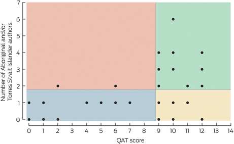 Significant heterogeneity of study designs resulted in a range of JBI LoE categories (Box 2). Individual QAT scores (Box 2) were also notably varied, with scores from 0 to 12 out of a possible 14 (Box 3). Analysis using the composite QAT scores of the final studies (Box 4) revealed strengths in Aboriginal and Torres Strait Islander leadership and consultation with Aboriginal and Torres Strait Islander community controlled organisations. Strengths‐based approaches and capacity building with Aboriginal and Torres Strait Islander people were also present. Areas for improvement were the reporting of intellectual property, cultural property, ownership and protection. There was a statistically significant association between the number of Aboriginal and Torres Strait Islander authors and higher scores on the QAT criteria (ρ = 0.0036). We created dichotomous variables, “Aboriginal and Torres Strait Islander authors” (< 2 or ≥ 2) and “QAT scores” (≤ 8 or ≥ 9), and found that studies with two or more Aboriginal and Torres Strait Islander authors were 12.75 times (95% confidence interval, 2.29–70.57) more likely to achieve a QAT score of 9 or more compared with articles with less than two Aboriginal and Torres Strait Islander authors (Box 5).