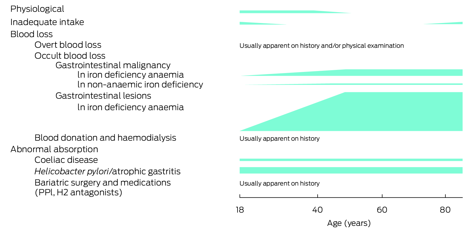 Blood loss is the most common and most significant pathological cause of iron deficiency, with aetiologies described in Box 2. Gastrointestinal blood loss accounts for most cases of iron deficiency,6,7,9,11,18 with bidirectional endoscopic examination detecting a potential gastrointestinal bleeding cause in two‐thirds of men and post‐menopausal women with IDA. Bidirectional endoscopic examination should be routinely considered for all adults with iron deficiency as the technique shows a detection rate of 11% for gastrointestinal malignancy and 9% for colorectal malignancy.6,7,8,9 Faecal occult blood testing is used for asymptomatic average‐risk bowel cancer screening and should not guide iron deficiency investigations.6,7 Small intestine investigation, predominantly with capsule endoscopy, may be considered in recurrent or refractory IDA following unremarkable bidirectional endoscopy results.19 When colonoscopy is contraindicated, computed tomography colonography can help rule out colorectal lesions larger than or equal to 6 mm, but cannot provide histopathological diagnosis.7,20 Medications can exacerbate blood loss, particularly non‐steroidal anti‐inflammatory drugs and anti‐thrombotics.6,7,8 Urinalysis is recommended to screen for microscopic haematuria, although this test is not sensitive for urological malignancies.6 Stool investigations for intestinal parasitic infections can be done for at‐risk individuals with exposure to endemic regions.8 Frequent whole blood donation can result in iron deficiency.11