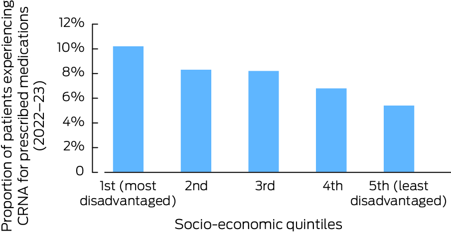 The de facto rate of medication‐CRNA is necessarily higher than what is reported in the ABS's survey. Their data are collected in the context of general practice visits only, so they would not include medicines prescribed by specialists. This is a significant lacuna since 42.2% of those surveyed needed to see a specialist,6 and it is reasonable to assume many of these patients would be prescribed some medication. The Australians that miss out on seeing a general practitioner or specialist due to cost would not get the chance to be prescribed medication.