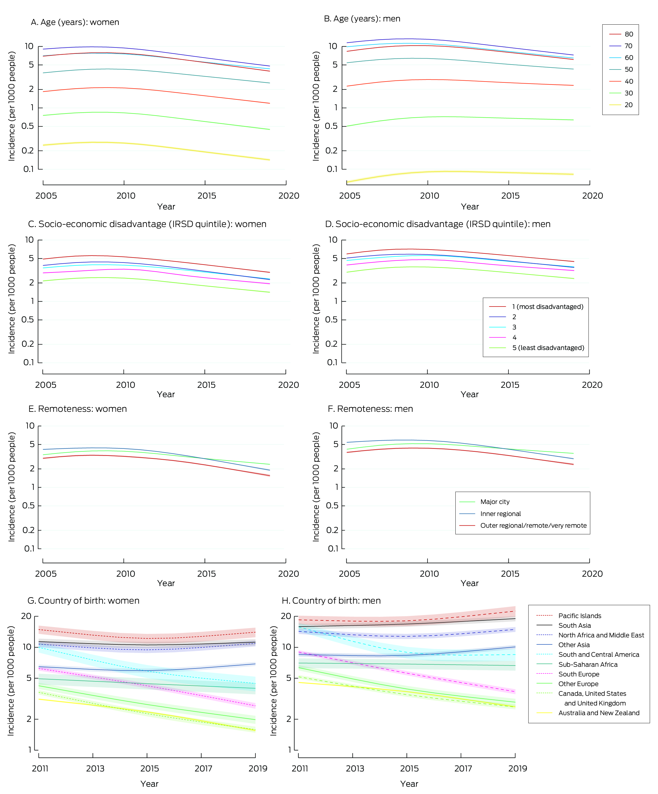 Results: During 2005–2019, 741 535 people aged 20 years or older with incident type 2 diabetes were registered with the NDSS; 421 190 were men (56.8%). Overall, the incidence of type 2 diabetes increased with age (until about age 70 years) and socio‐economic disadvantage for both sexes; it was higher in inner regional areas than in major cities or outer regional/remote/very remote areas during 2005–2015, but highest among people in major cities after 2015. The age‐standardised incidence of type 2 diabetes increased during 2005–2010, both among men (annual percentage change [APC], 4.4%; 95% confidence interval [CI], 3.6–5.2%) and women (APC, 2.9%; 95% CI, 2.2–3.7%); it declined during 2010–2019 among both men (APC, –5.2%; 95% CI, –5.4% to –4.9%) and women (APC, –6.5%; 95% CI, –6.8% to –6.2%). In general, similar patterns (but of differing magnitude) applied to all age, sex, socio‐economic disadvantage, and remoteness groups. However, the incidence of type 2 diabetes increased during 2011–2019 among people born in Asia, North Africa and the Middle East, and the Pacific Islands.