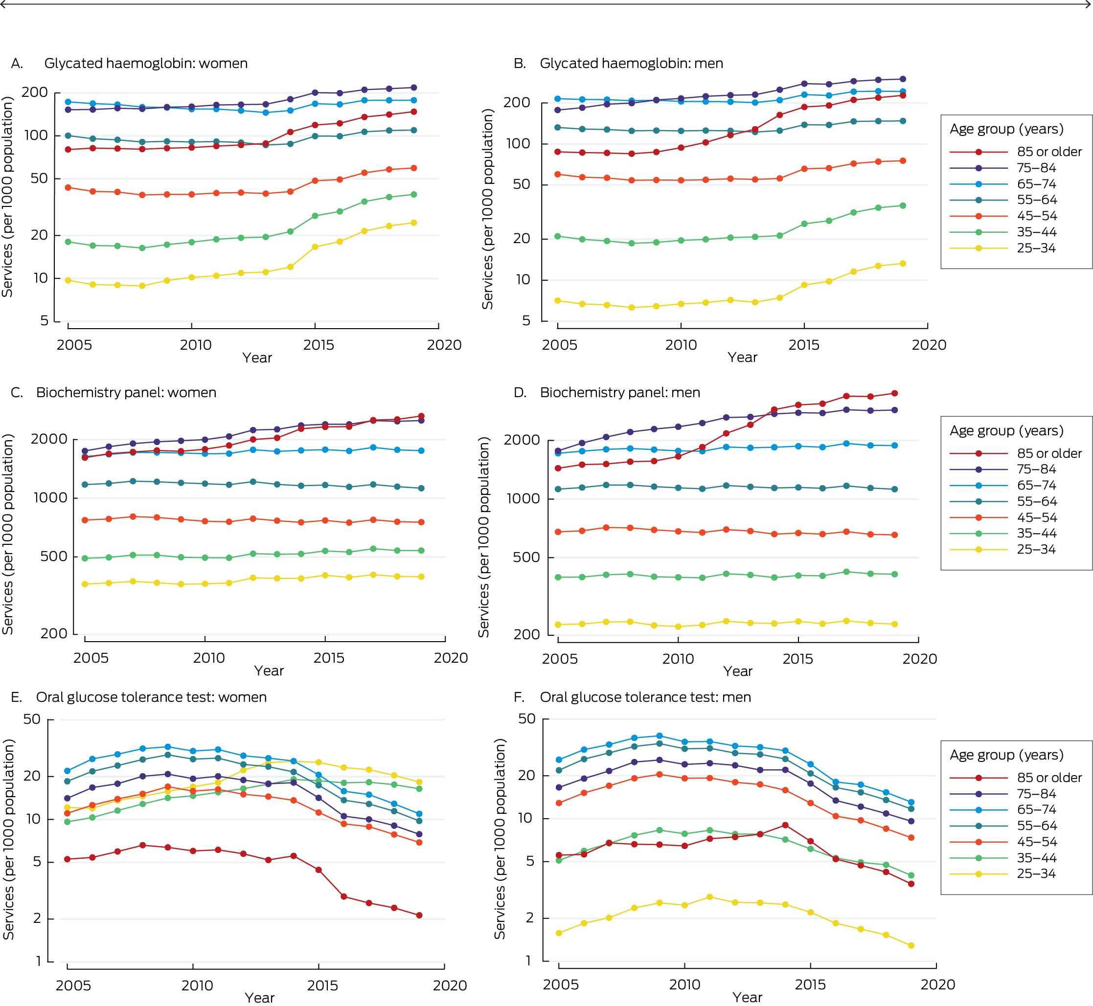 Annual age‐ and sex‐specific service data for biochemistry panel testing (including blood glucose levels: MBS item numbers 66500, 66503, 66506, 66509, 66512, 66515; MBS item 66515 was replaced in 2008 by item 66512), oral glucose tolerance test (MBS item number 66542), and glycated haemoglobin (HbA1c; MBS item numbers 66551 and 66841; the latter item was introduced on 1 November 2014) for the four jurisdictions were obtained from the Services Australia website.20