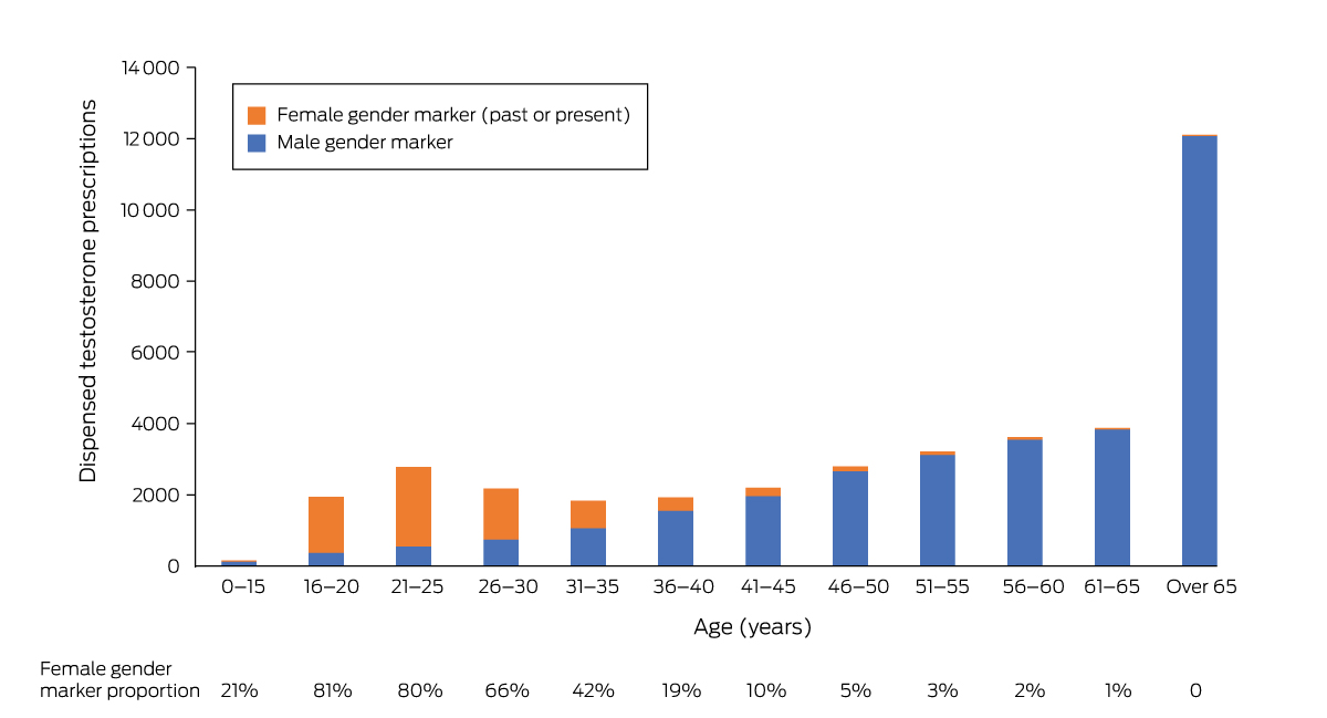 Of the 38 633 people dispensed PBS‐subsidised testosterone during 1 July 2021 – 30 June 2022, current or past female gender markers were recorded for 6998 (18%). The proportion differed markedly by age group: 6394 of 10 805 people aged 40 years or younger had current or past female gender markers (59%), including 3795 of 4726 people aged 16–25 years (80%), but only 33 of 12 114 people over 65 years of age (0.3%) (Box).