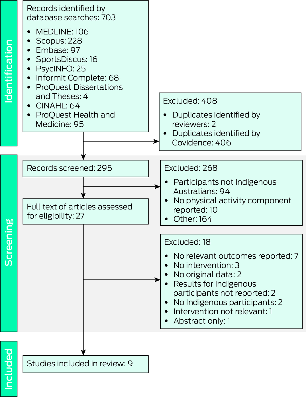 The database searches identified 703 potentially relevant records; after removing 408 duplicates, the titles and abstracts of 295 publications were screened. A total of 268 records were excluded, most because the participants were not Indigenous Australians, or because no physical activity component was reported (eg, nutrition counselling only). The full text of 27 articles was assessed for eligibility, of which 18 were excluded: seven did not report outcomes related to type 2 diabetes, three did not report relevant interventions, two did not separately report data for Indigenous participants, two did not include Indigenous Australians, two were reviews that provided no original data, one did not include physical activity in the intervention, and one was an abstract (Box 1).