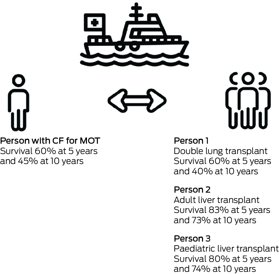 The next step is to assess whether it is fair to allocate several organs to a single patient when there are many others awaiting single organ transplant. This is a version of what we could call the transplant lifeboat problem.12,13 Our patient (Box 2; “Person with CF for MOT”) requires two lungs and a liver. If he does not receive transplantation, those organs would be available to two or perhaps three other patients (if a split liver transplantation). Based on local data,2 our patient will have a similar survival outcome to a double lung transplantation (for other indications) at five years and ten years. Patients who receive a liver transplant have an even greater survival advantage.