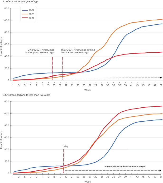 Laboratory‐confirmed RSV infections and associated hospitalisations became notifiable in WA under the Public Health Act 2016 on 16 July 2021.11 We extracted data for all notified RSV infections in children under five years of age with dates of specimen collection during 2022–2024 from the WA Notifiable Infectious Disease Database (WANIDD) on 6 January 2025. Patient administration data systems are matched weekly with WANIDD using birthdate, surname, and first name initial. An admission was deemed an RSV‐associated hospitalisation if a positive RSV test result was recorded for a specimen collected between ten days before and seven days after an admission to hospital. We restricted the quantitative comparison of RSV‐associated hospitalisations by year to weeks 18–52 (May to December) to reduce bias caused by unusually high number of RSV infections in early 2022 following the easing of coronavirus disease 2019 pandemic control measures. The mean number of RSV‐associated hospitalisations in 2022 and 2023 was defined as the expected number for 2024.