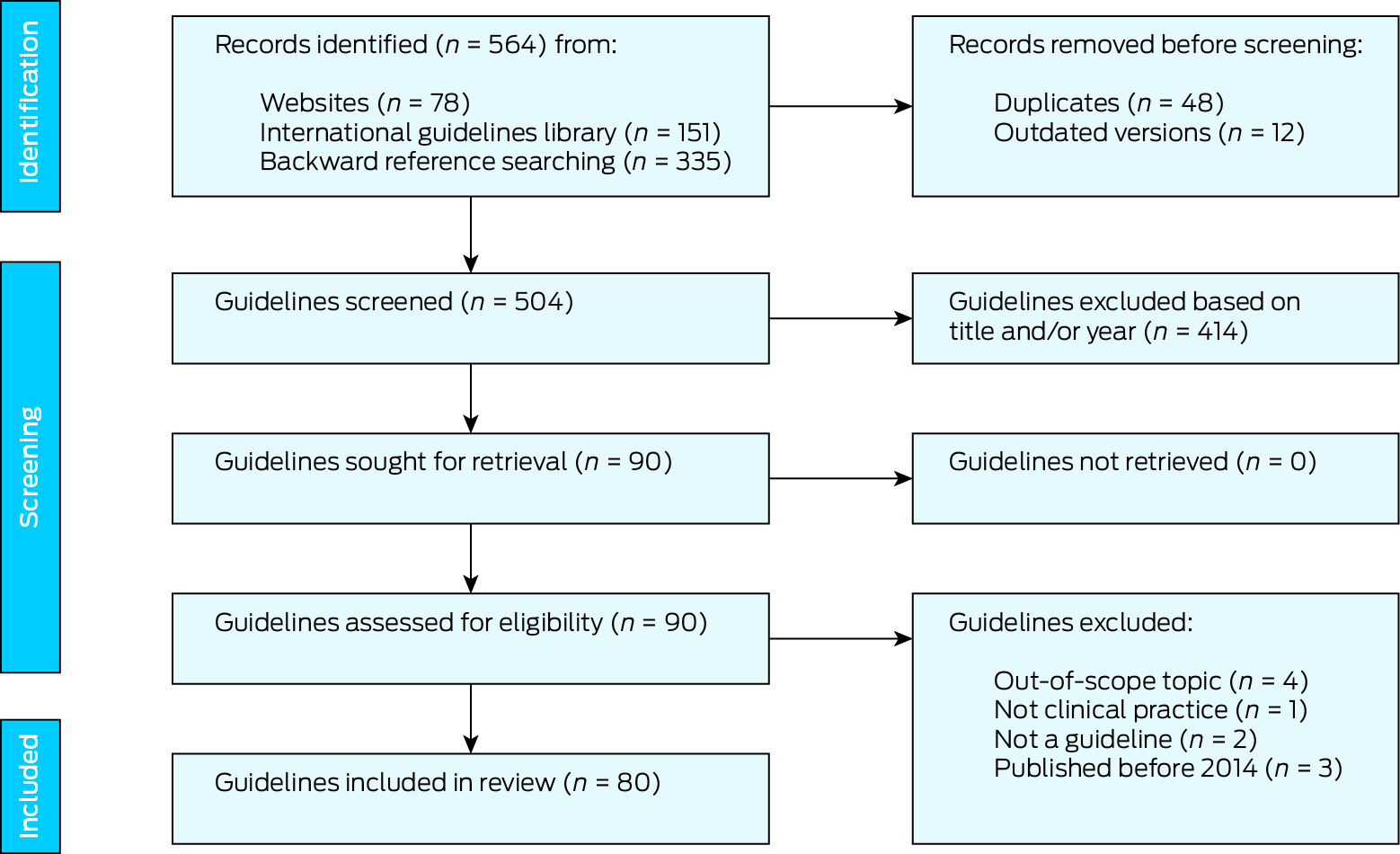 We searched the Guidelines International Network international guidelines library, limiting the search to Australia as the country of application, and conducted a Google search with the keywords “clinical guidelines” and “Australia”. We also searched the websites of organisations likely to have relevant guidelines (eg, the NHMRC, health care professional colleges, universities, federal and state governments, associations, societies, foundations, and non‐government organisations). In addition, we searched the list of over 400 Australian clinical guidelines identified by authors who had access to the now‐defunct NHMRC guideline database.20 Furthermore, we sought a representative example of guidelines from the Royal Australian and New Zealand College of Obstetricians and Gynaecologists (in theory, dealing only with women's health) and from the Urological Society of Australia and New Zealand (which deals predominantly with men's health) so as not to skew for sex‐specific guidelines.